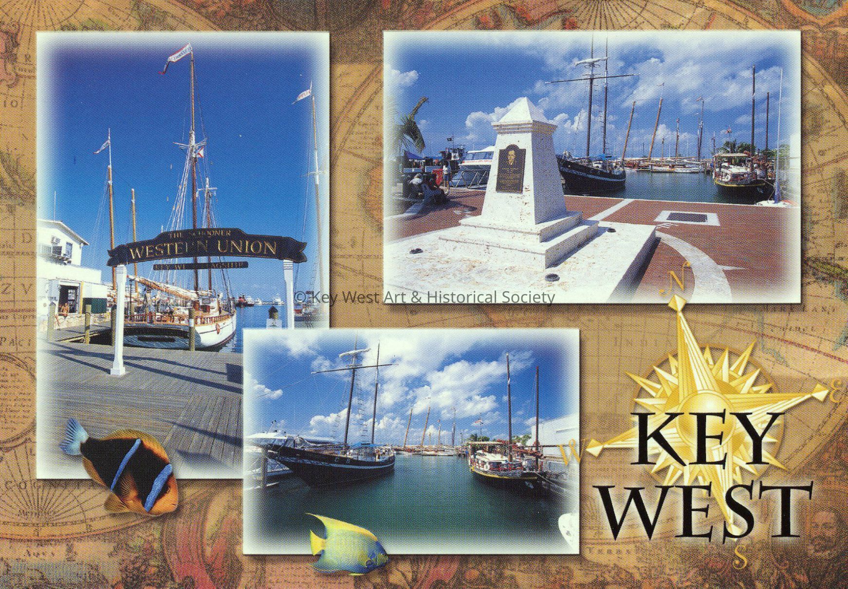 Postcard depicting three view of the Key West Bight including the Schooner WESTERN UNION and the Norberg Thompson plaque.