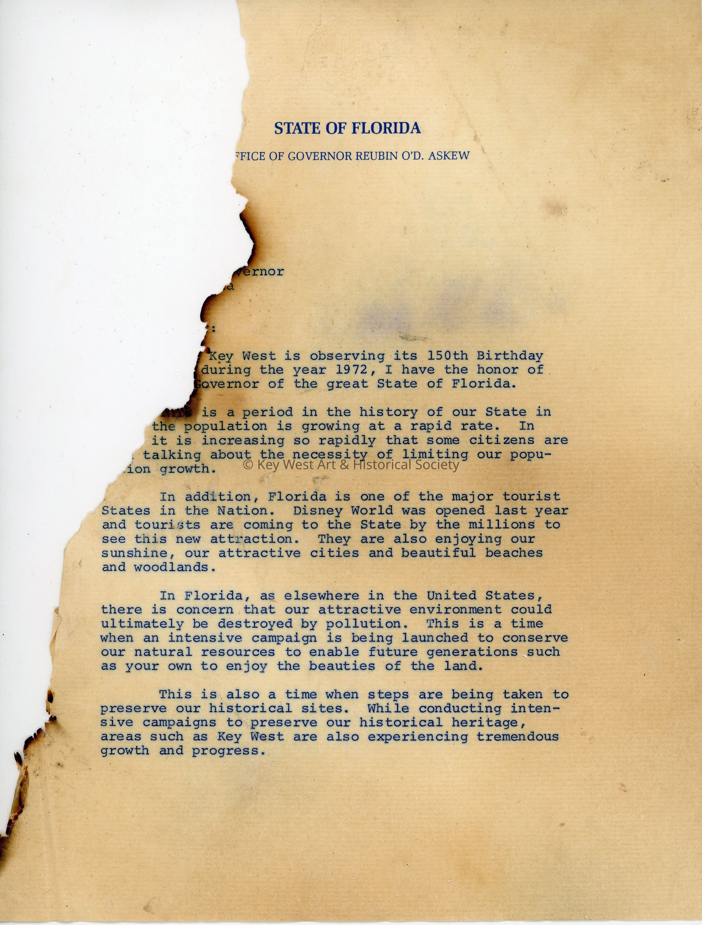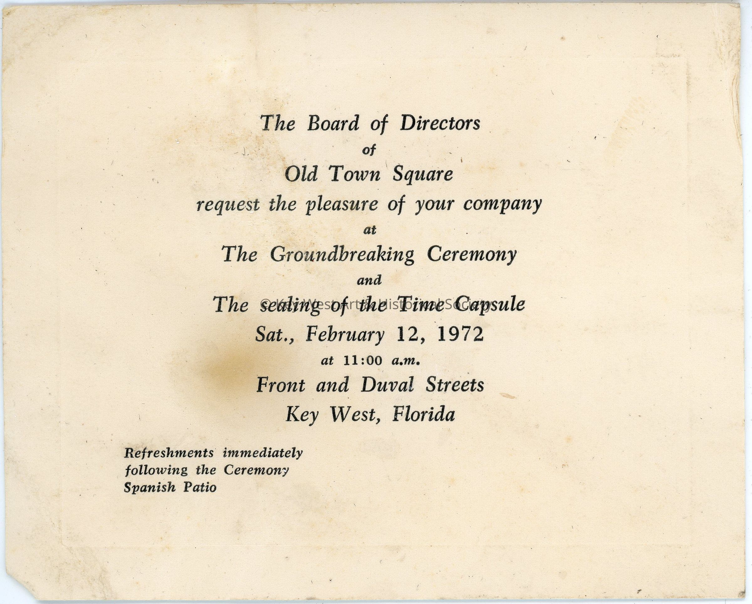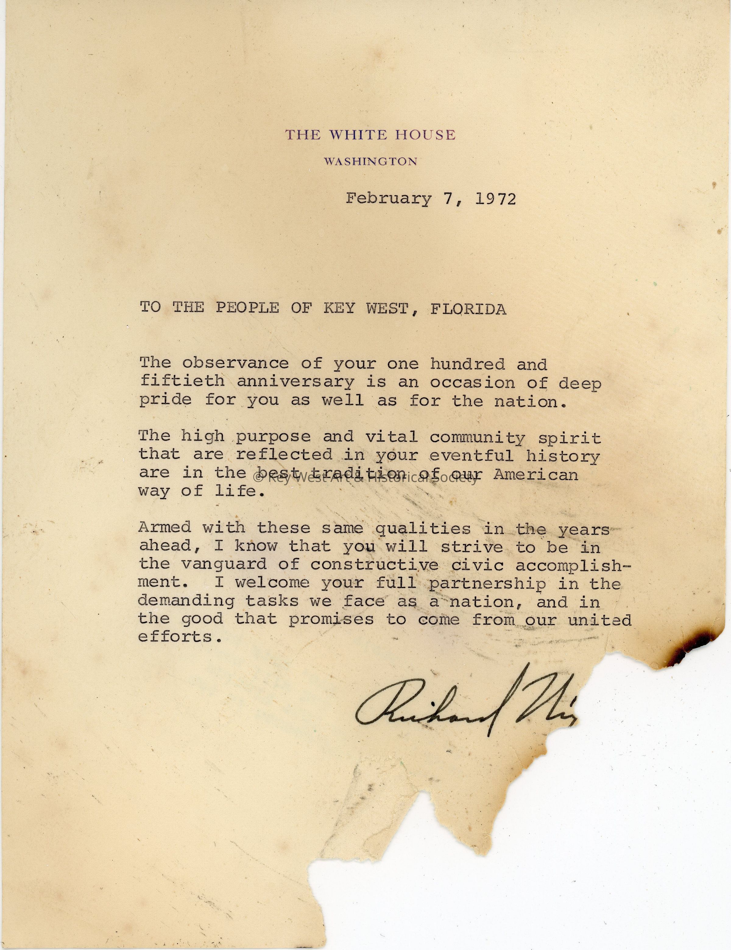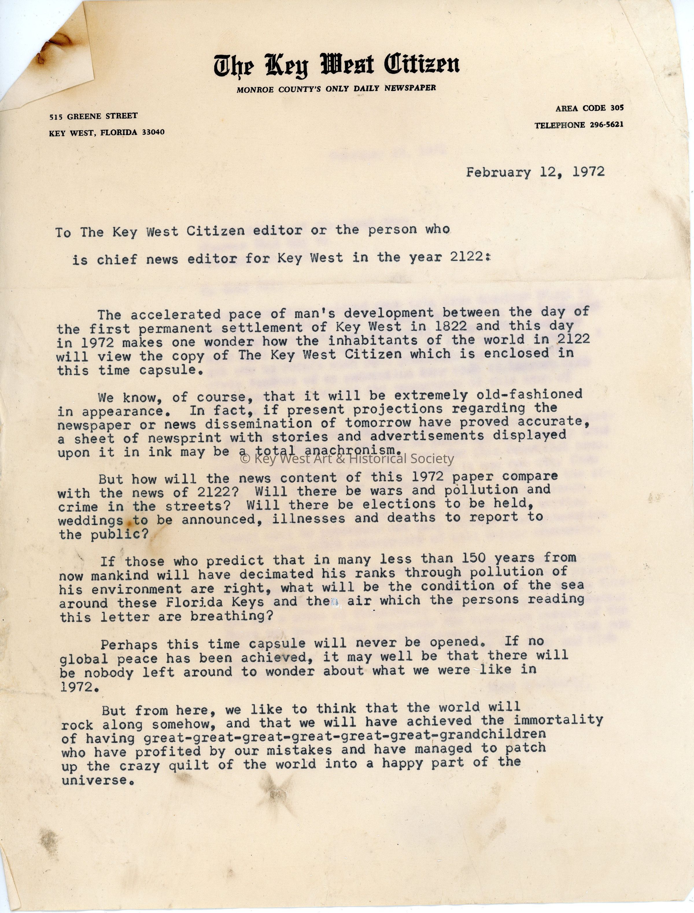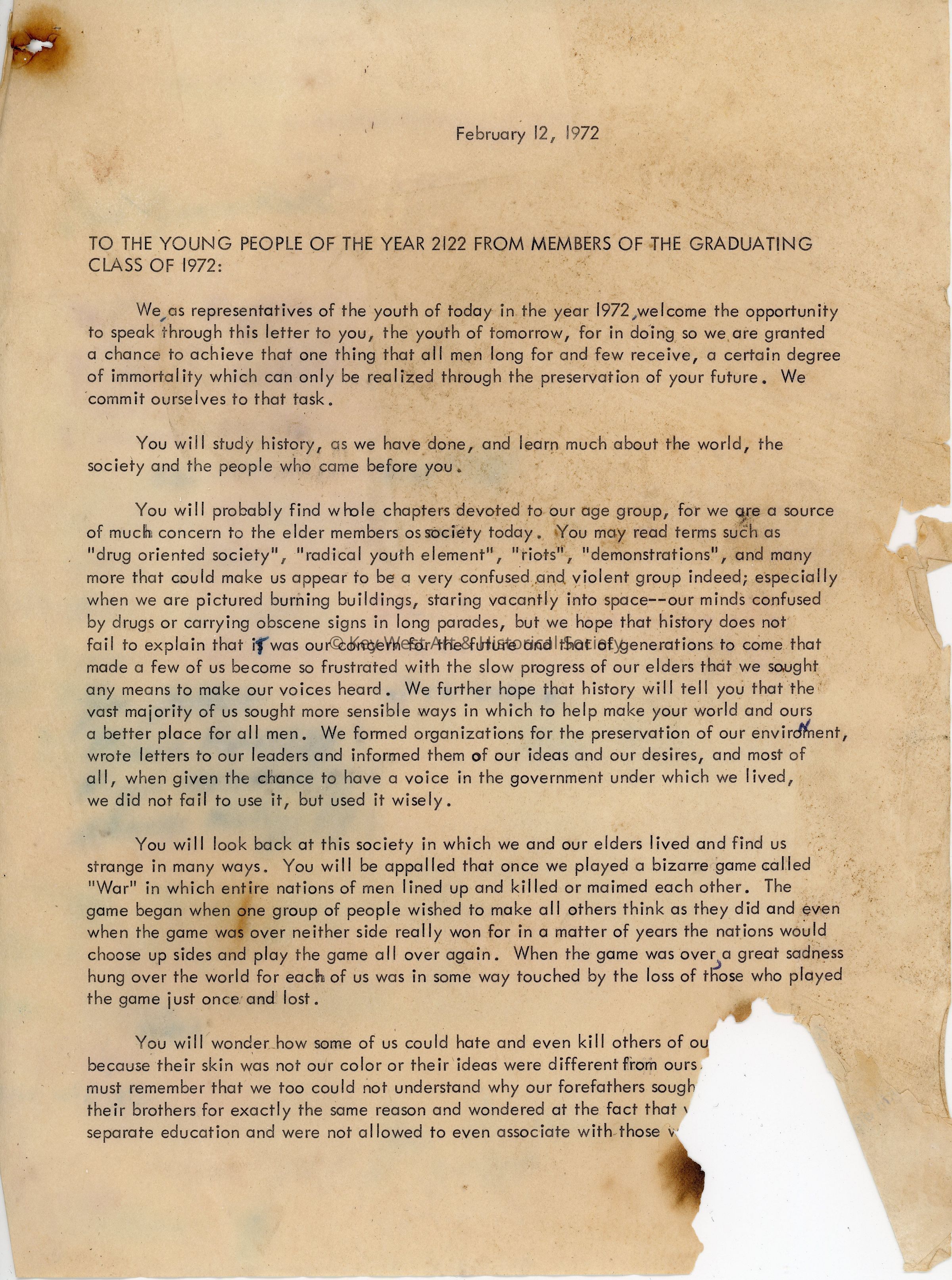 Contents of the Key West 150th Anniversary Time Capsule buried in 1972. Documents include letters from President Richard Nixon, the Key West Citizen editor, and the Key West Sesquicentennial Commemoration Program amongst other letters and documents from politicians, schools, and newspapers.Collection