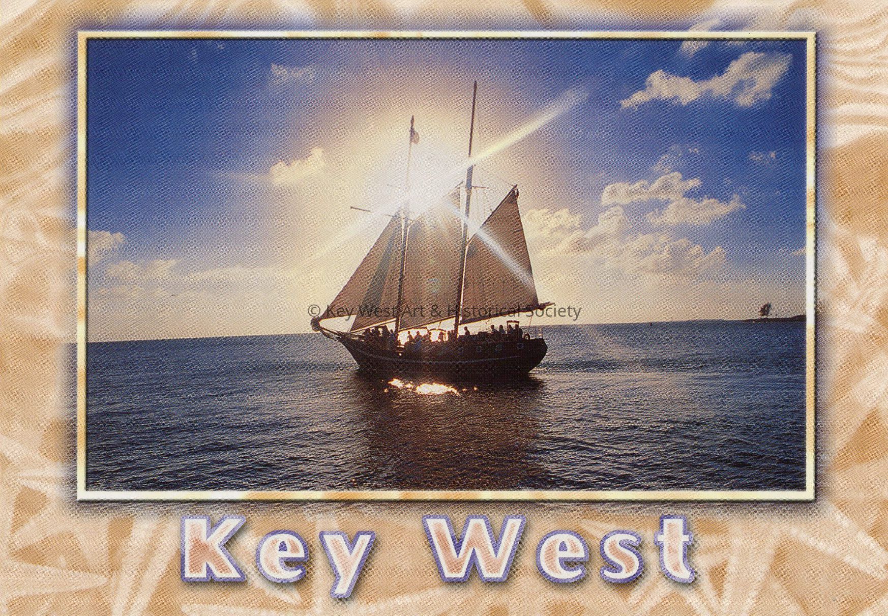 Postcard depicting a schooner under full sail. Notation on verso, 'This schooner's mast splits the light from the setting sun, just off Mallory Square during the nightly sunset festival.'Subject Place