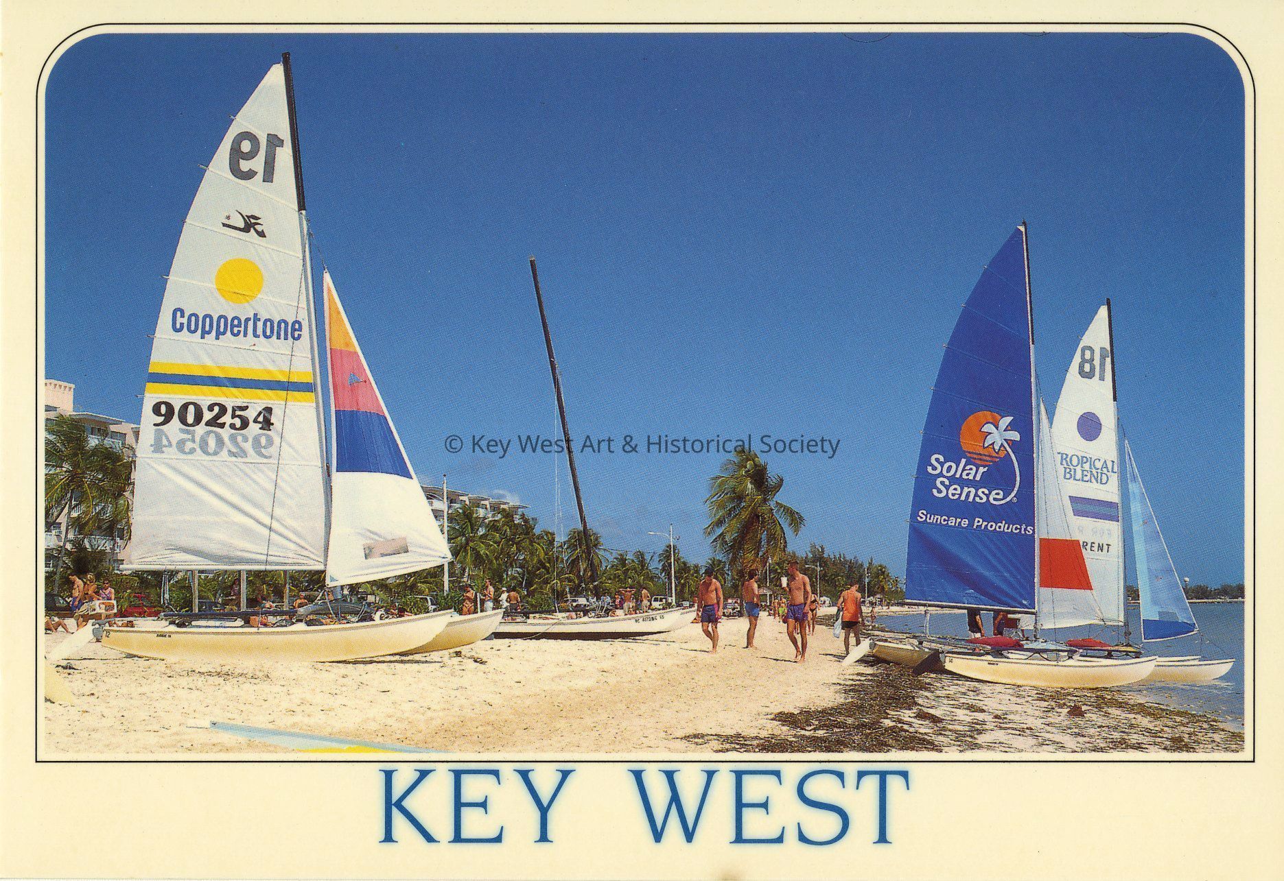 Postcard depicting Smathers Beach with Hobie Cats on the sand.