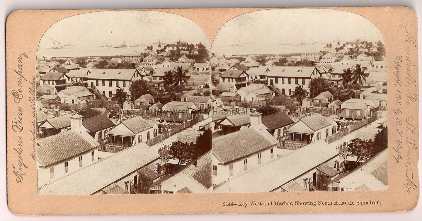 Stereoview taken from the top of the Key West Lighthouse looking toward Fort Zachary Taylor. The US Navy's North Atlantic Squadron seen in harbor during the Spanish-American War. Accession # 2008.36.0002.
