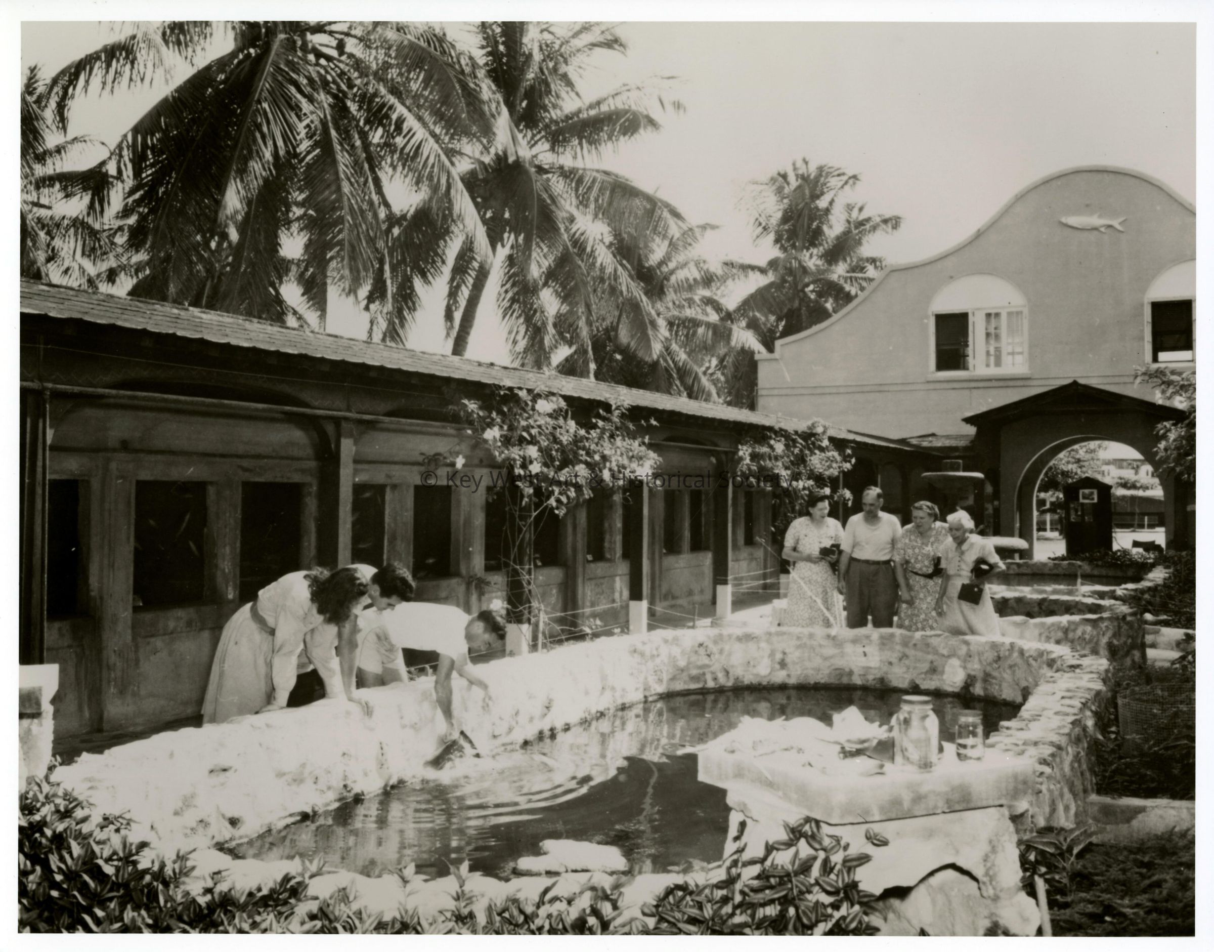 Black and white photograph of a group of unknown people at the open-air Key West Aquarium.