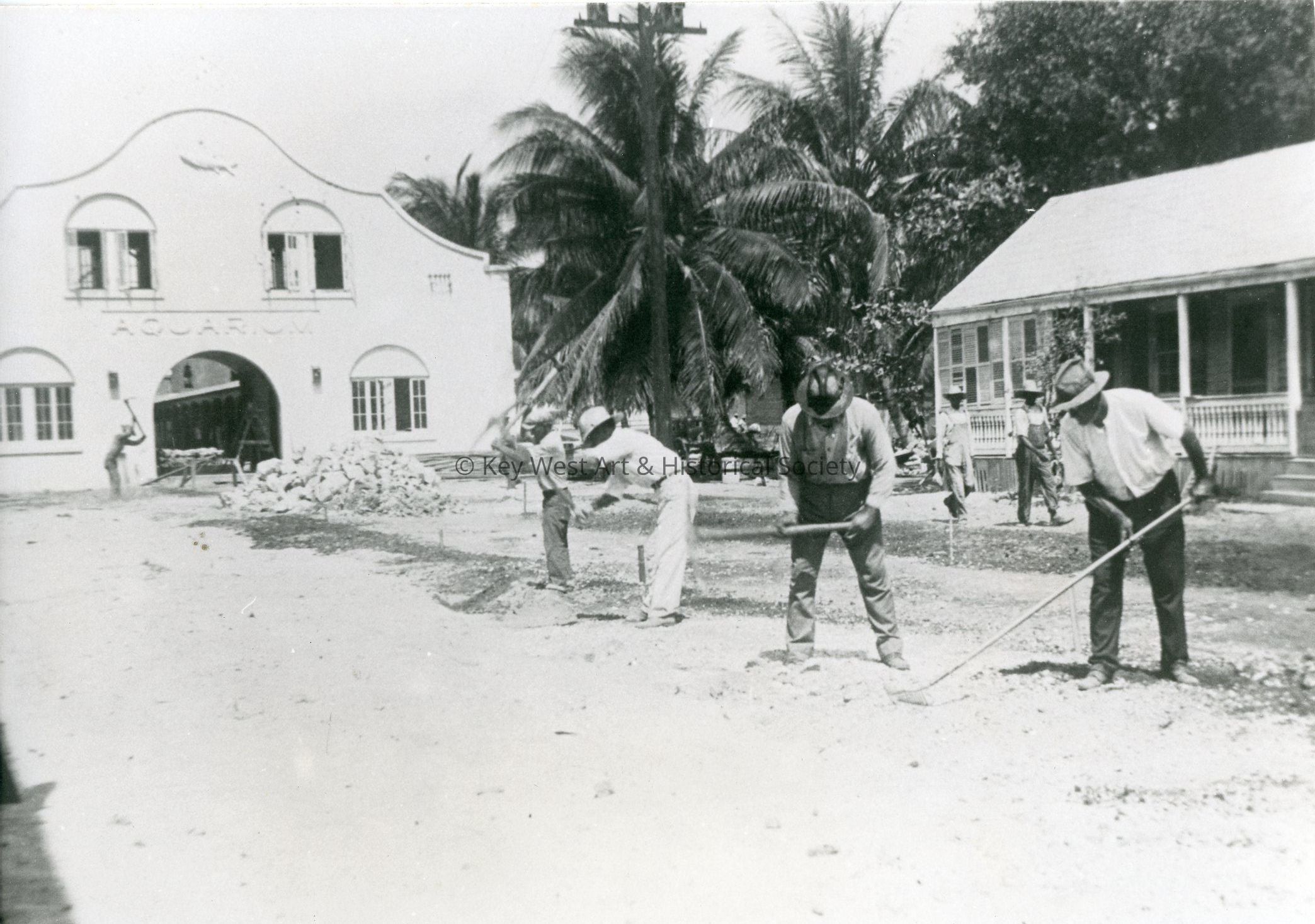 Black and white photograph of coconut palms being planted at the Key West Aquarium during its construction in the mid- 1930s.