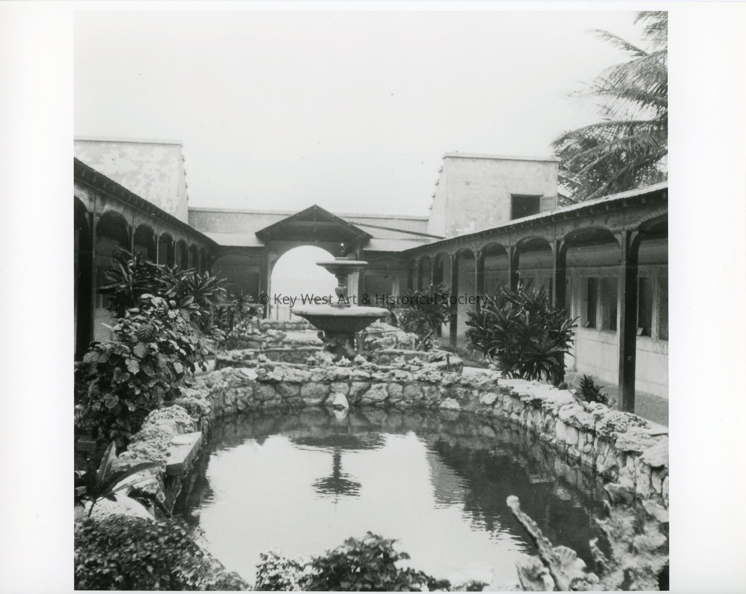 Black and white photograph of the Key West Aquarium open air interior.