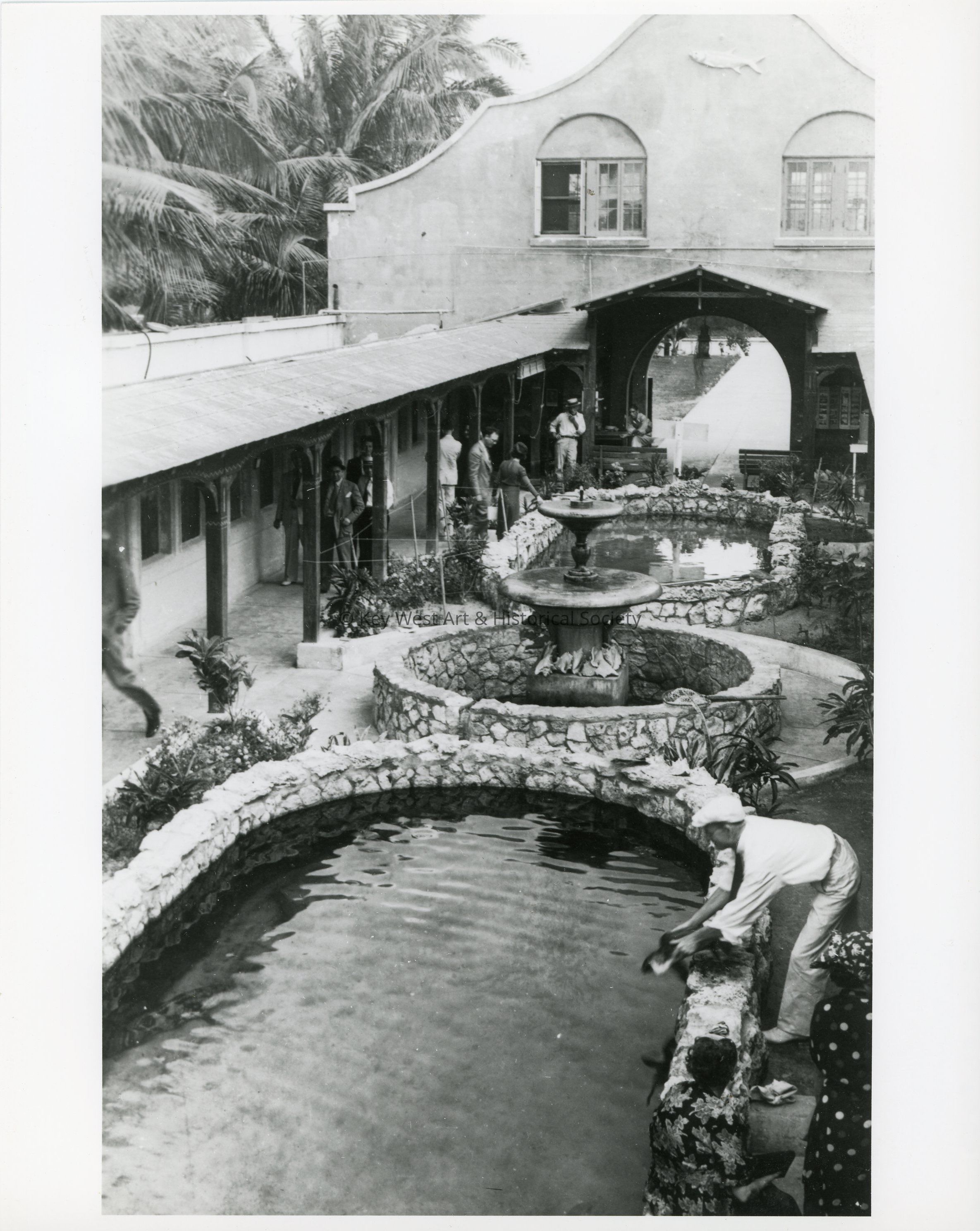 Black and white photograph of the open-air interior of the Key West Aquarium, with visitors gathered around the central tanks near the entrance.