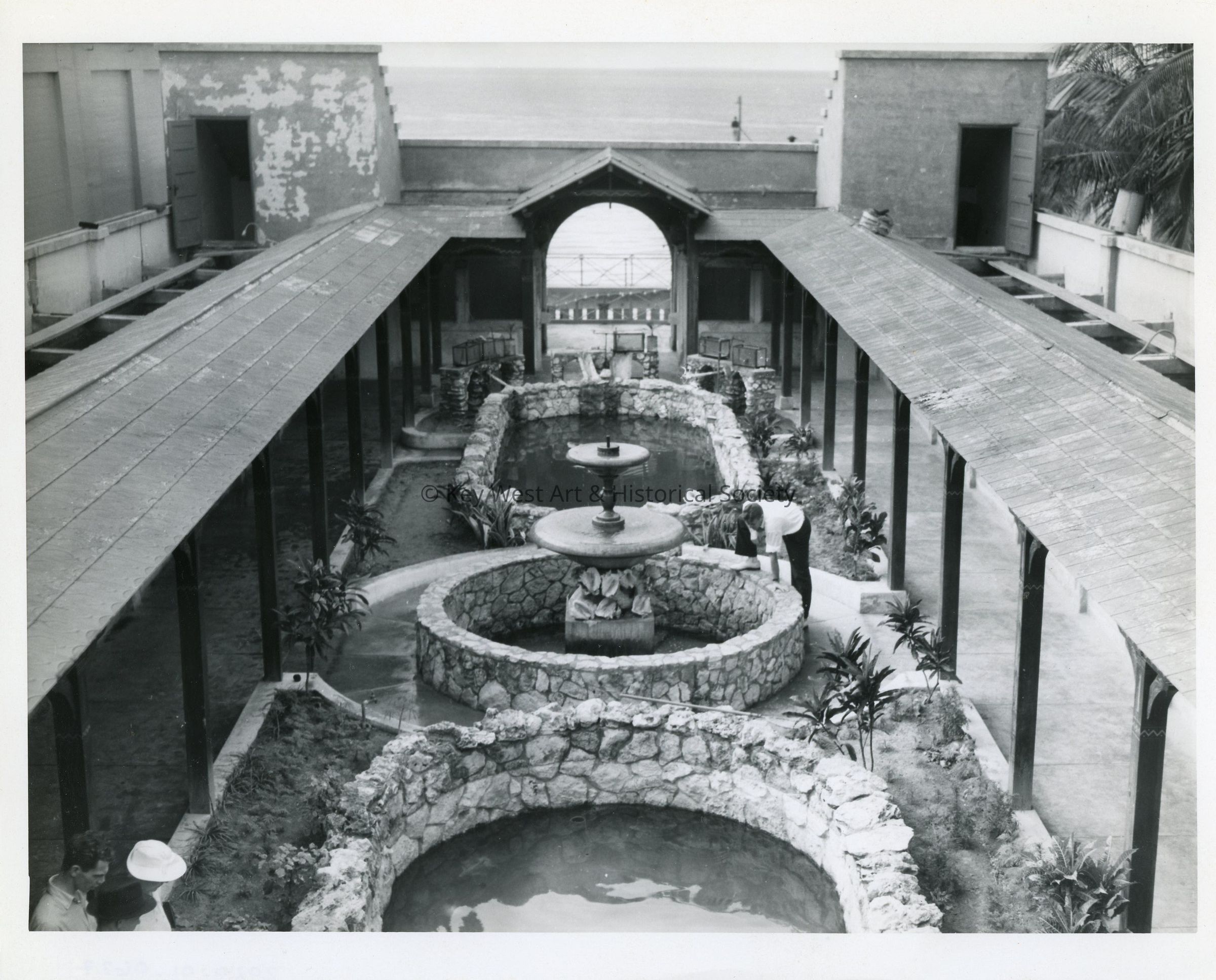 Black and white photograph of the open-air interior of the Key West Aquarium looking out toward the Gulf of Mexico.