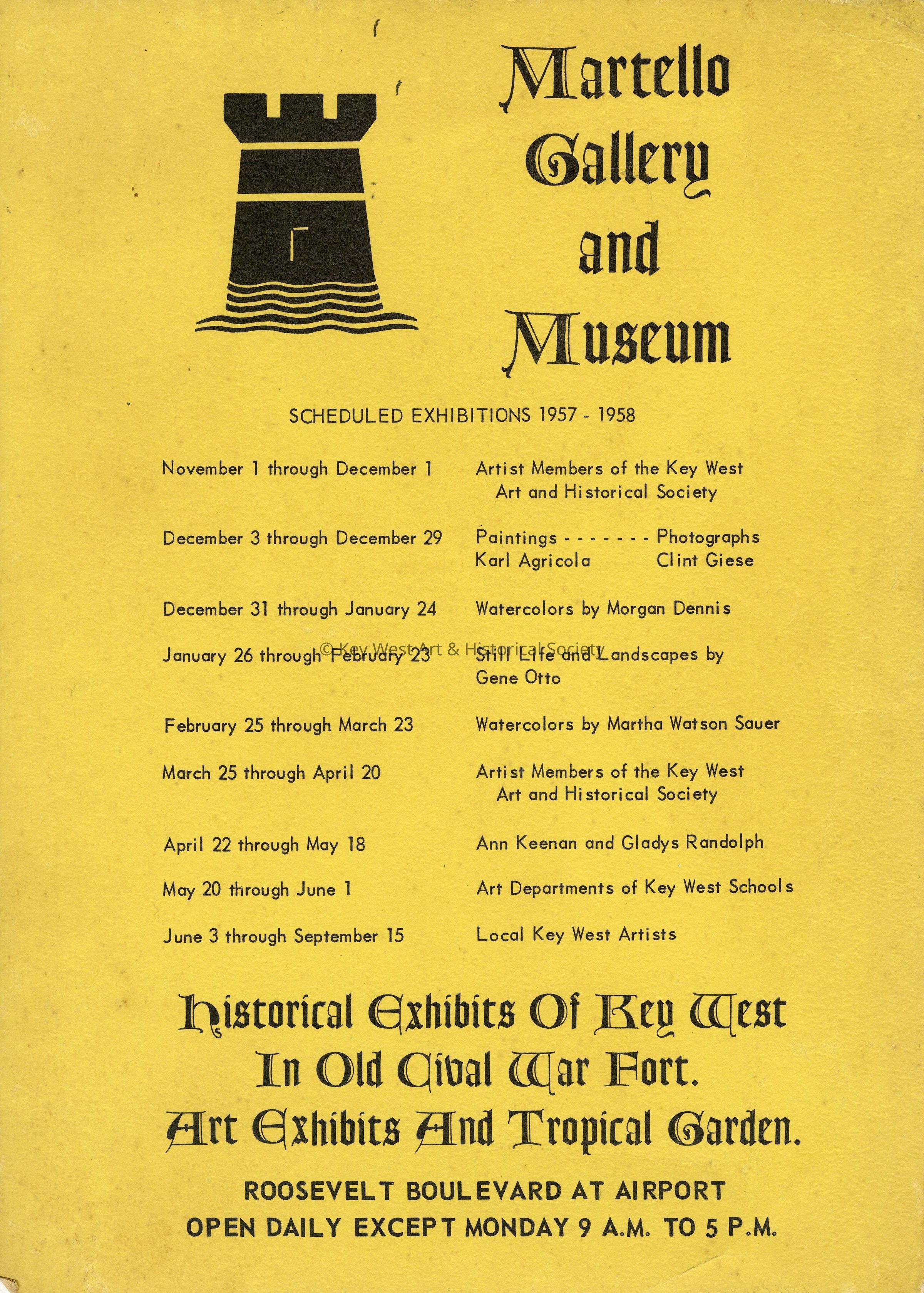 Black print on yellow poster board advertising season events for 1957-1958. "Martello Gallery and Museum Scheduled Exhibitions 1957-1958".Collection