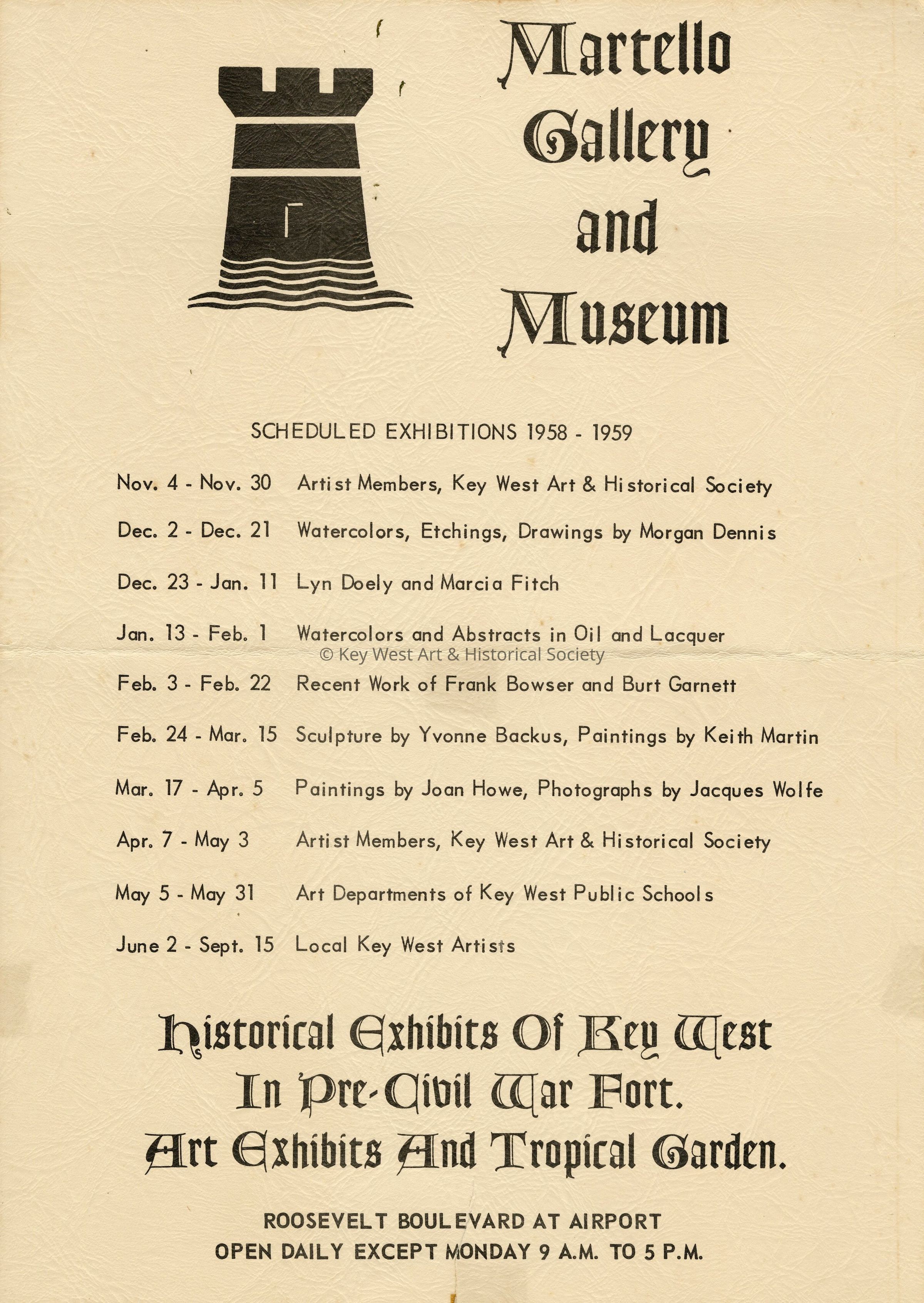 Black print on white poster board advertising season events for 1958-1959. "Martello Gallery and Museum Scheduled Exhibitions 1958-1959".Collection