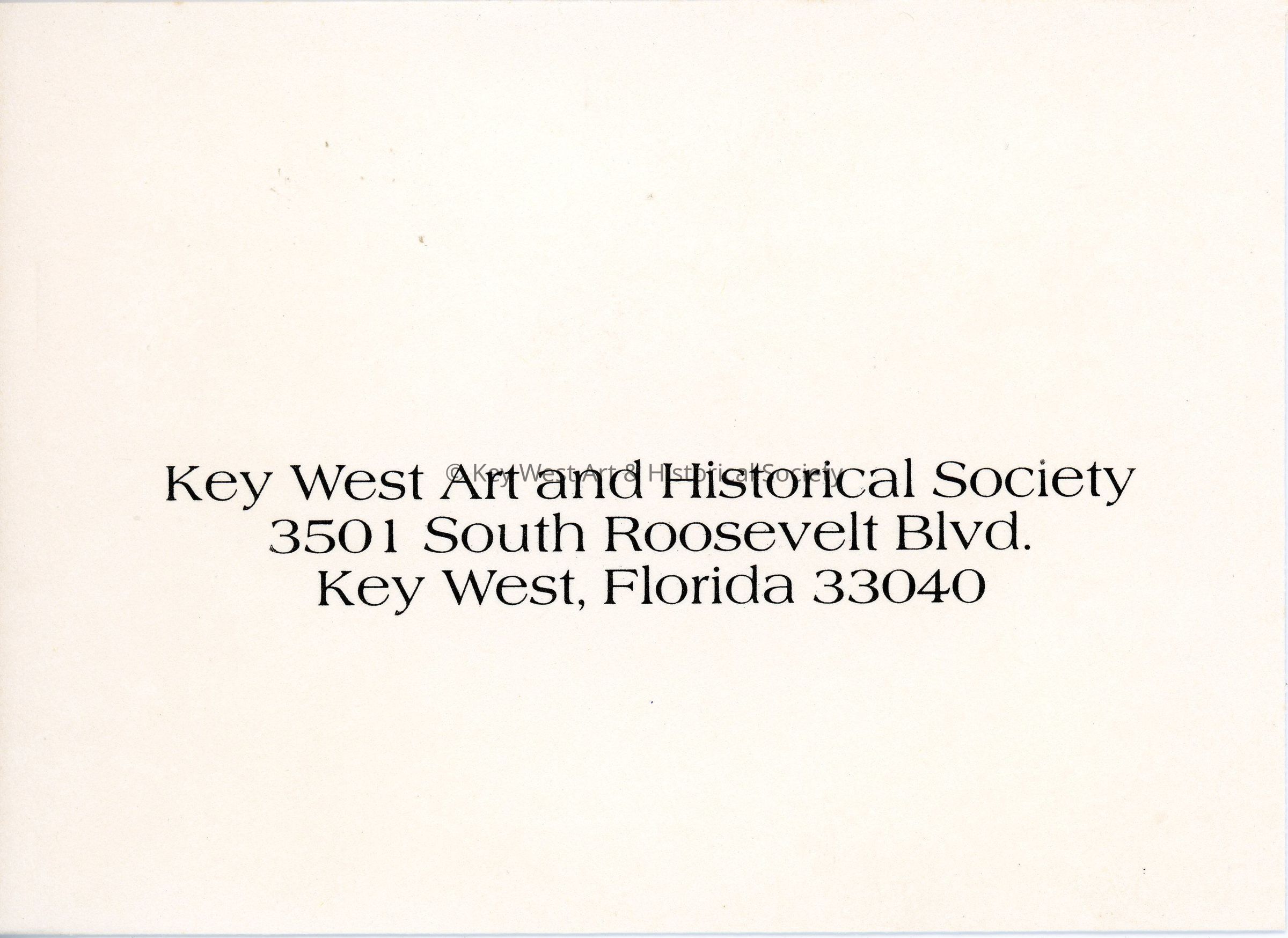A pre-addressed envelope to mail an RSVP card for the Key West Lighthouse Restoration Cocktail Reception to celebrate the United States Coast Guard Group Key West and the Bicentennial of the American Lighthouse Service. The event was held on August 5, 1989 at the Key West Lighthouse Museum at 938 Whitehead Street.
