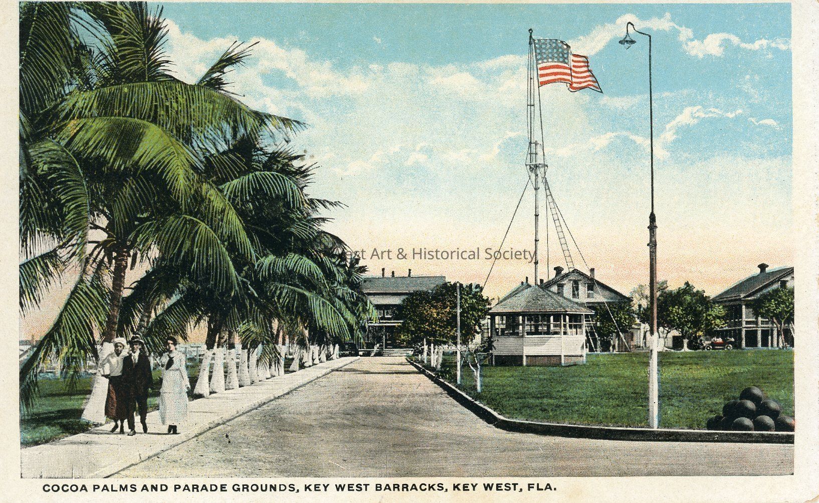 Postcard depicting cocoa palms and parade grounds, Key West Barracks, Key West, Florida.Collection