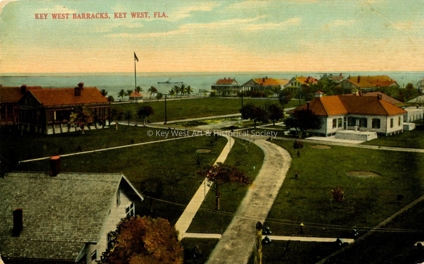 Postcard depicting the U.S. Army barracks and Parade Grounds on the present-day site of Peary Court. The caption reads, 'Key West Barracks, Key West, Fla.Subject Person/Organization