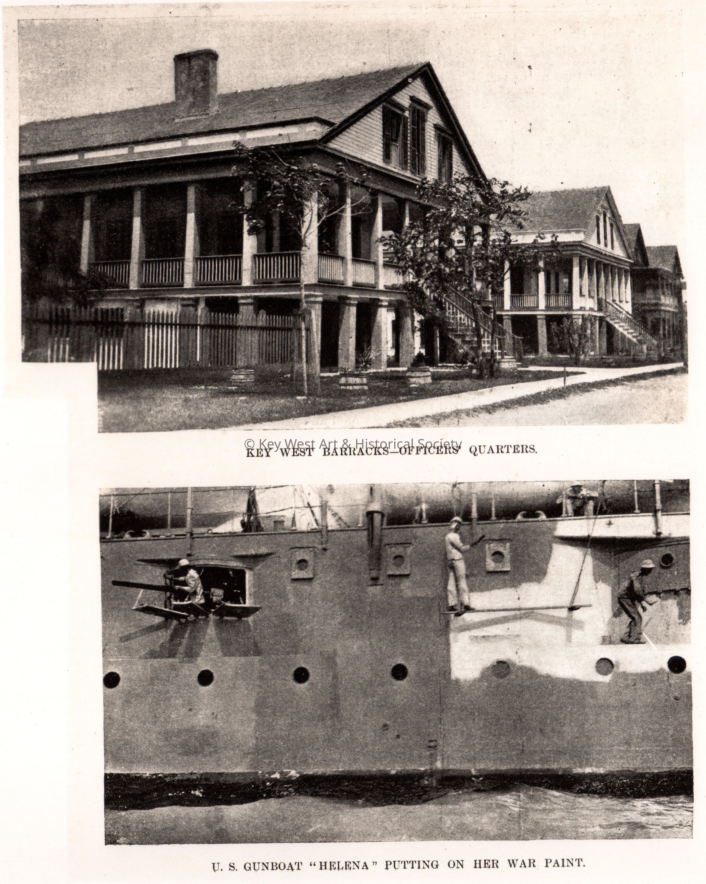 Two photos - Key West Barracks Officers' Quarters and US gunboat "Helena" putting on her war paint (addding camouflage).Collection