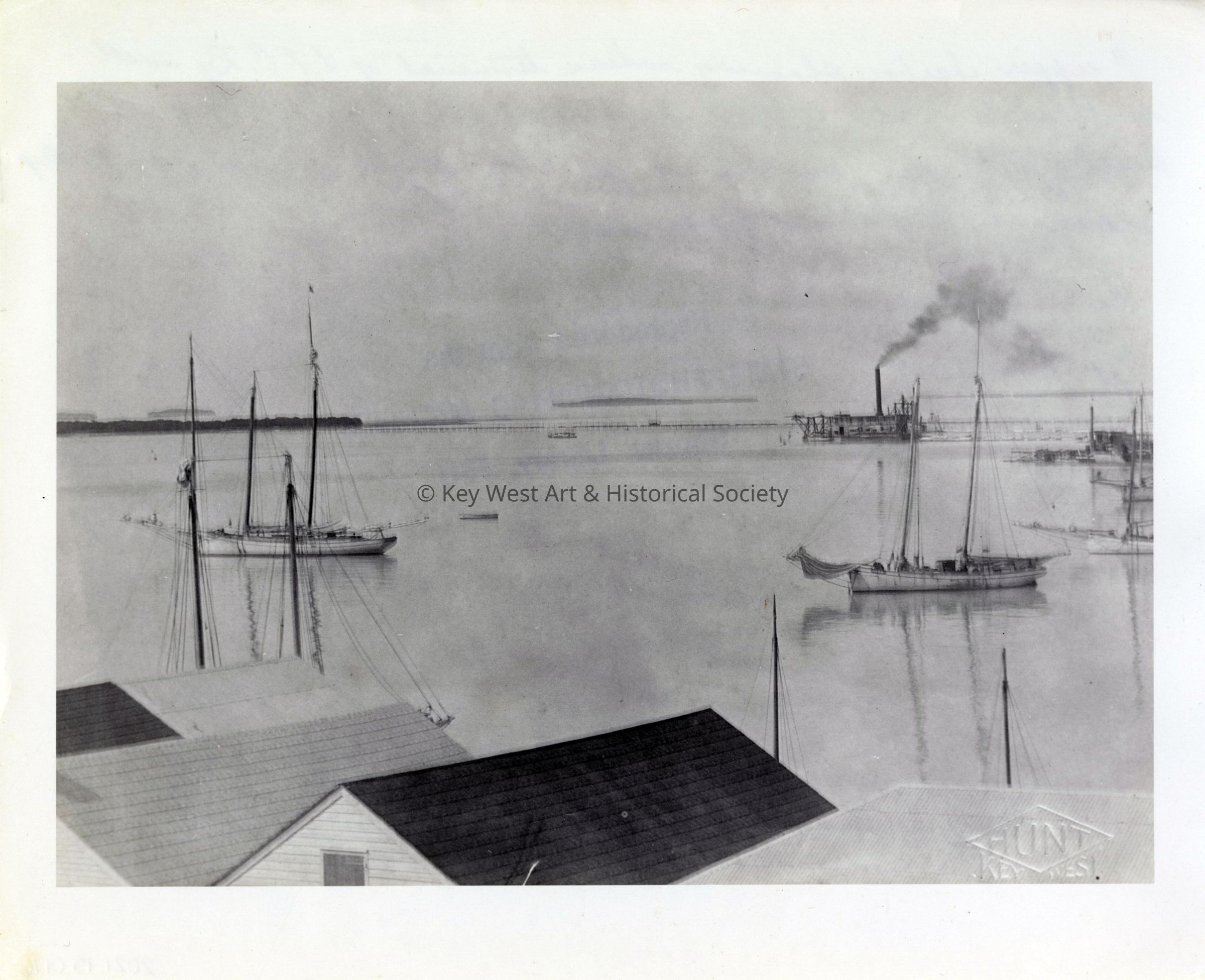 Black and white photograph of the Key West Bight. Caption on verso, 'upper harbor showing where terminal of the F.E.C. Ry will be located. Man of War harbor at side of fill depth of water 20'. One hundred feet to left of fill the water is 35' deep. Mangrove Key at end of pipe line.'