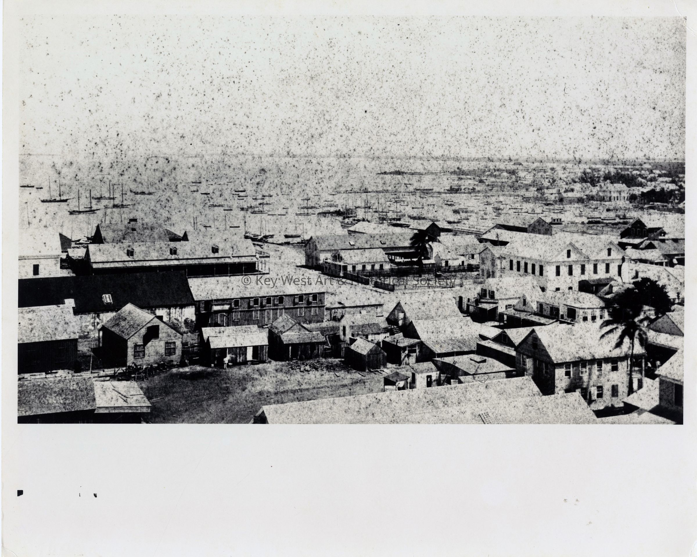 Black and white photograph of Key West Bight looking east possibly from the top of Old City Hall.