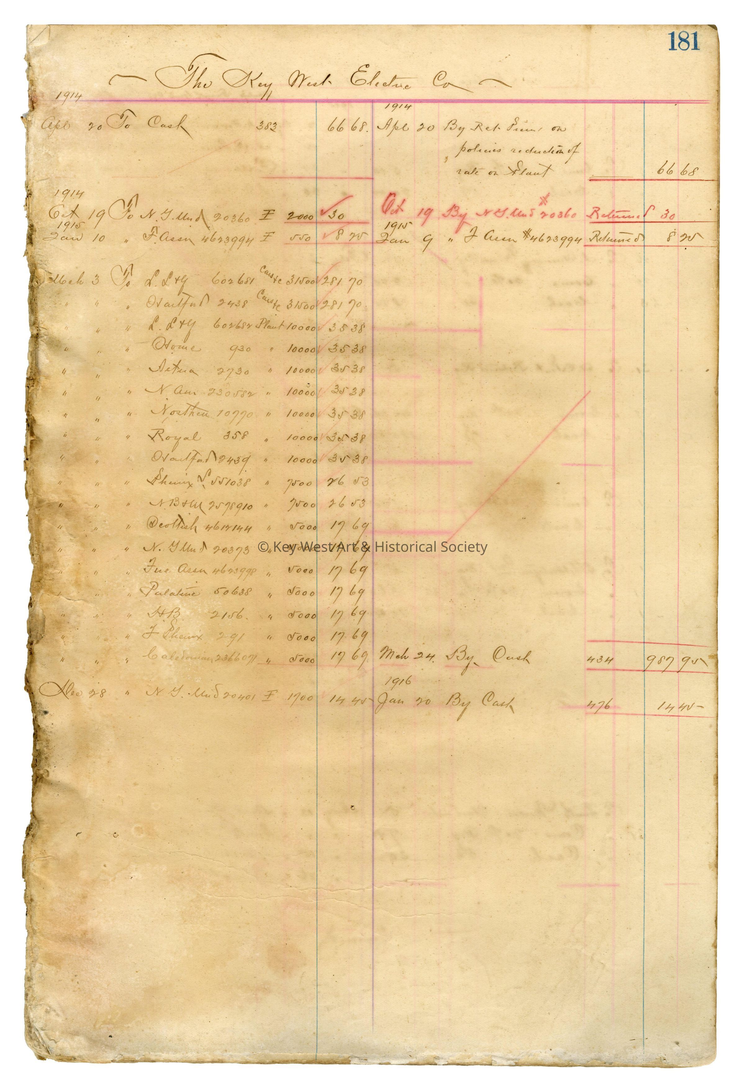 A 42-page portion of an unknown Key West business ledger, possibly a surety company. It contains approximately 800 entries for individuals and businesses located in Key West between 1907 and 1915. Names include Key West Electric Company, John B. Maloney, Key West Drug Company, Louis Wolfson, Ruy Lopez Company, Walter D. Cash and Cortez Cigar company.Collection