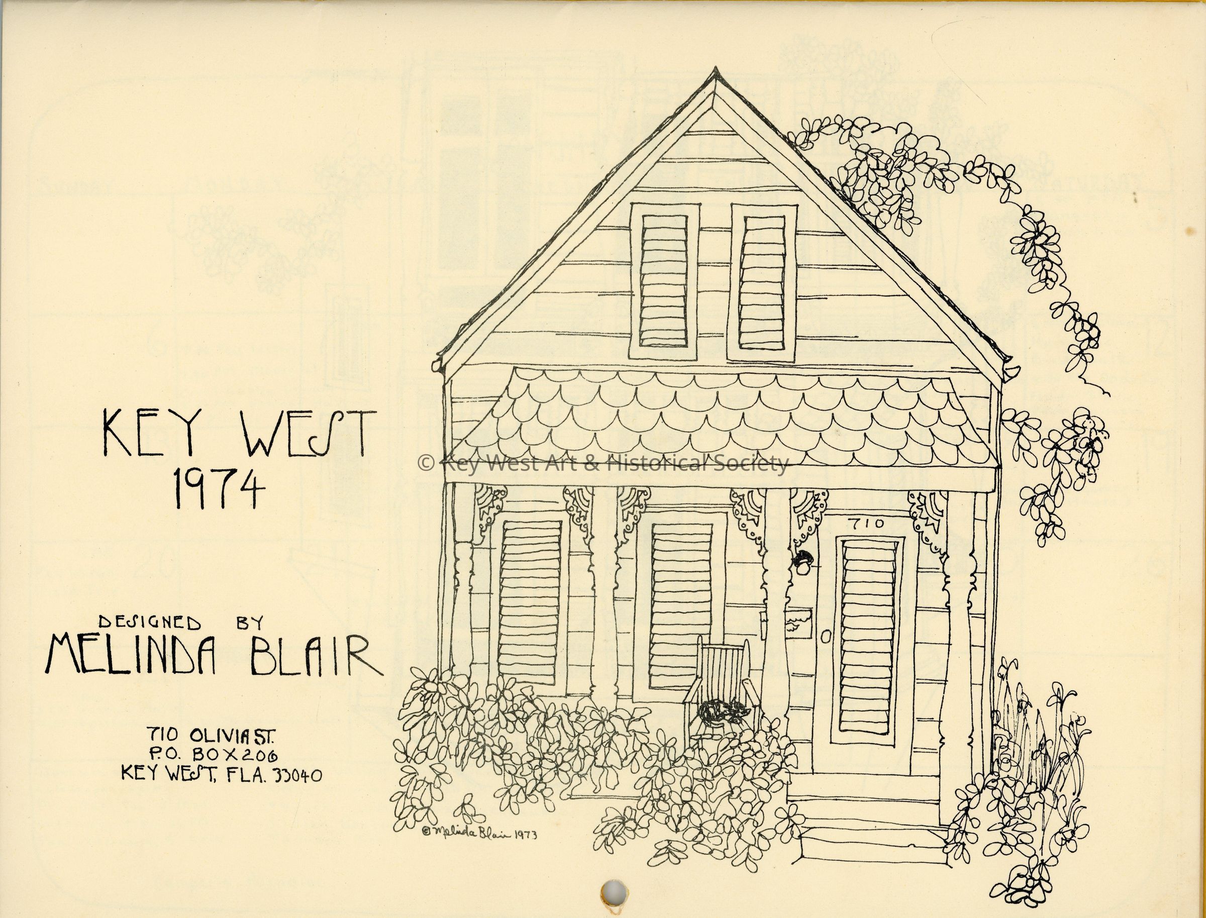 A 1974 year calendar designed by Melinda Blair featuring her drawings of architectural features and homes in Key West.Collection