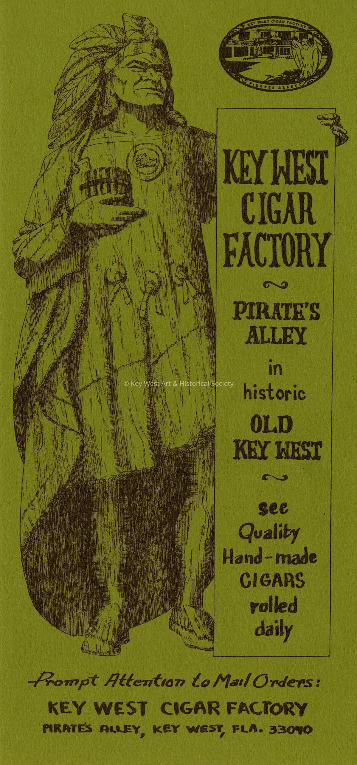 Single page flyer advertising the Key West Cigar Factory in Pirate's Alley.Collection