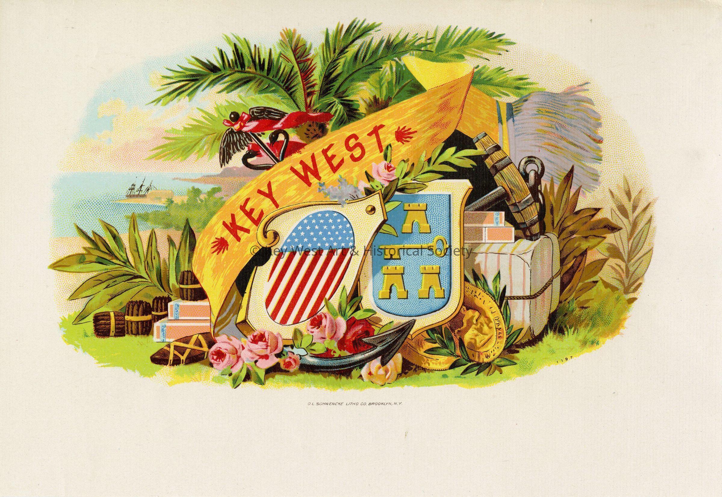 Full color lithograph inner box cigar label promoting an unknown Key West brand. Likely taken from a sample book produced by the lithographer. Depicts Havana coat of arms and an American flag inset into an adjacent shield.Type of Print