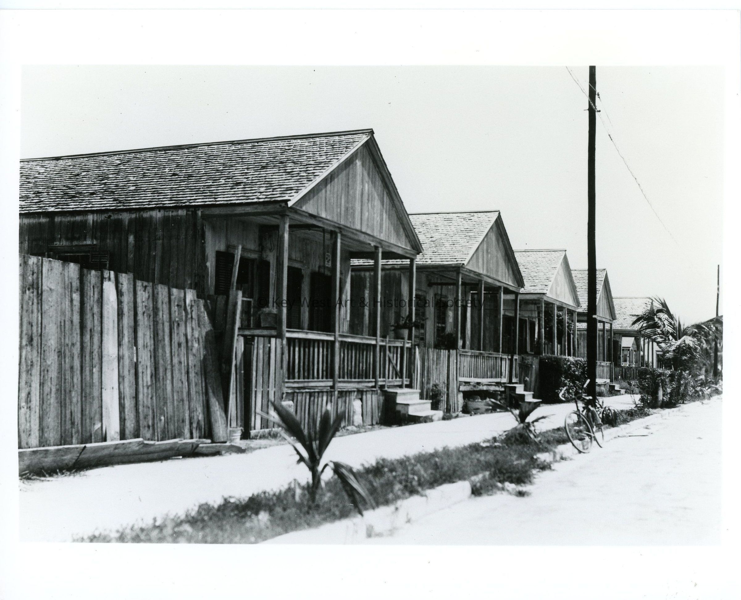 Black and white photograph of a row of cigar makers cottages on a dirt street.