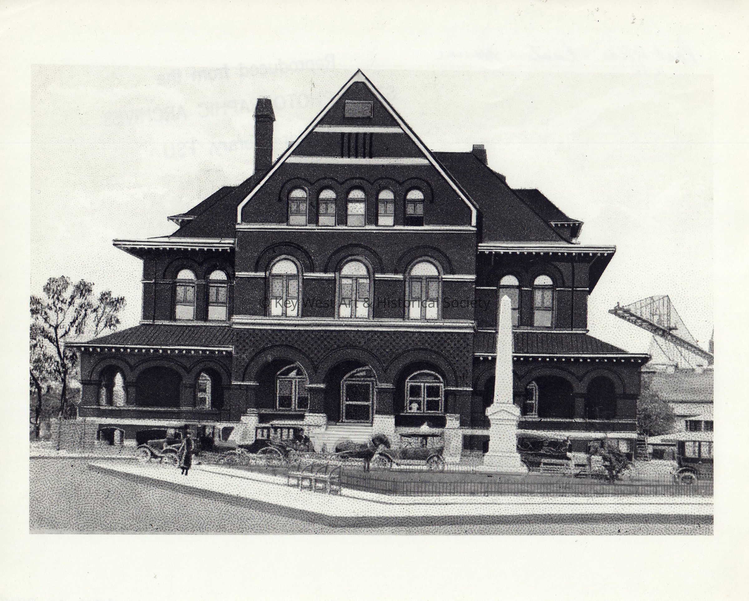 Black and white photograph of a color postcard of the Key West Custom House and Post Office. Clinton Square is seen in the foreground.