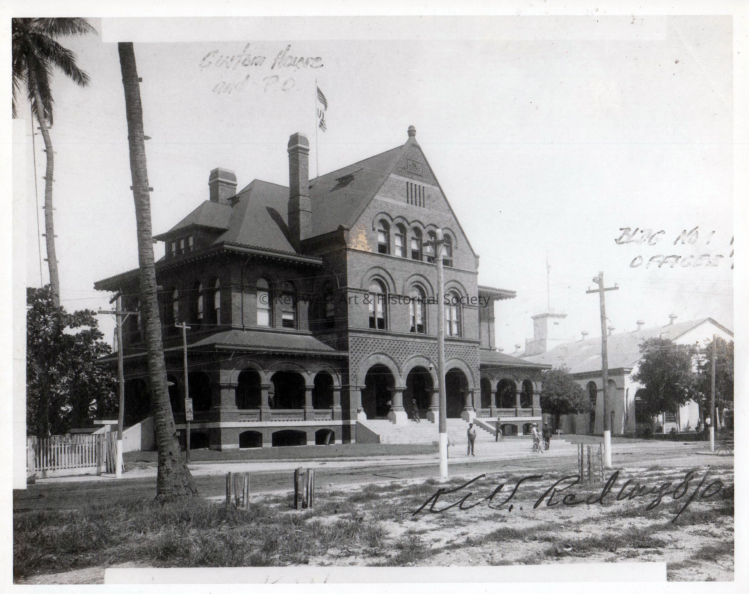 Black and white photograph of the Key West Custom House and Post Office. The U.S. Navy's Building 1 is seen on the right hand side.