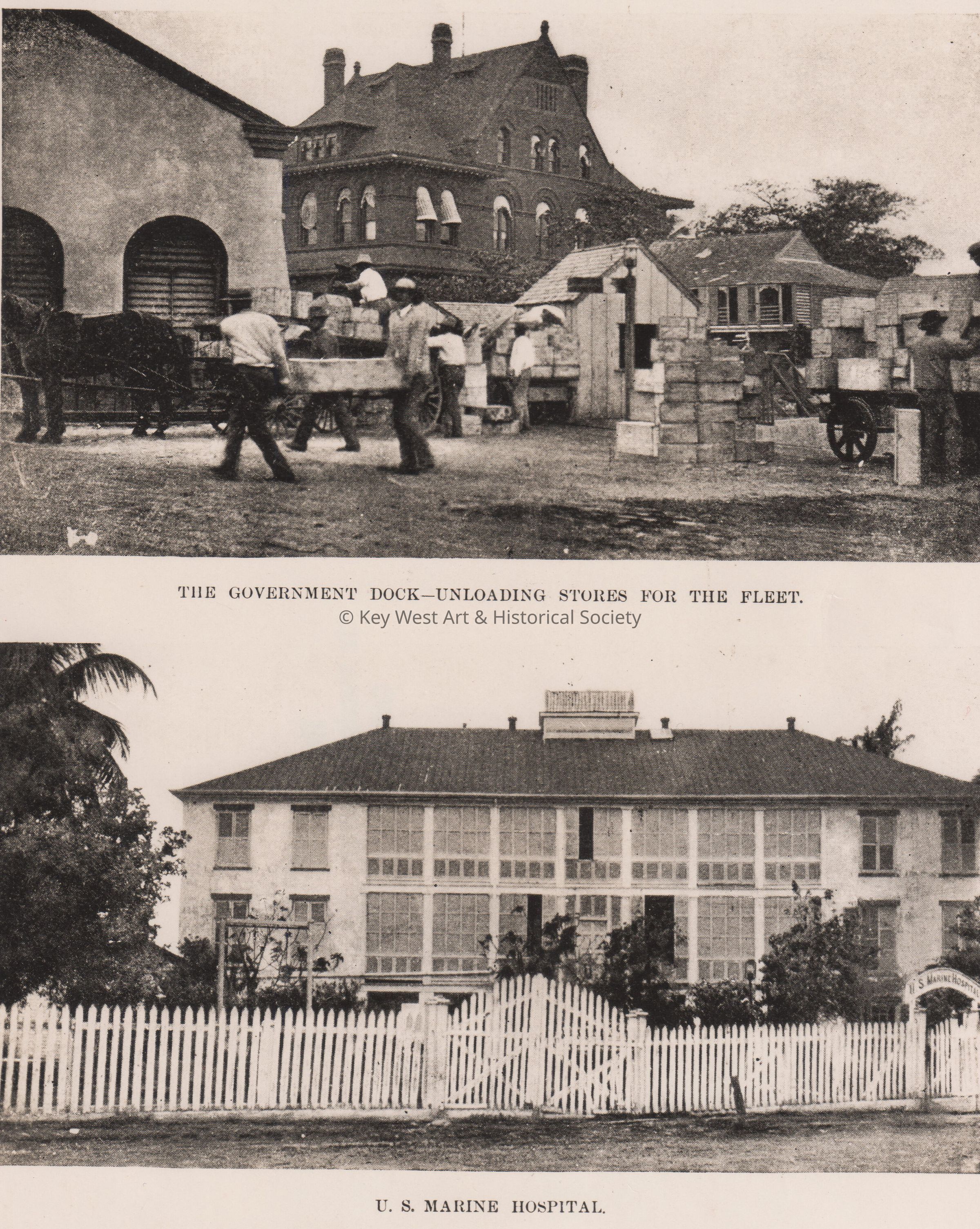Black and white photograph of the Key West Custom House and the Marine Hospital at Naval Station Key West during the Spanish-American War. Captions read, 'The Government Dock - Unloading Stores for the Fleet' and 'U.S. Marine Hospital'.