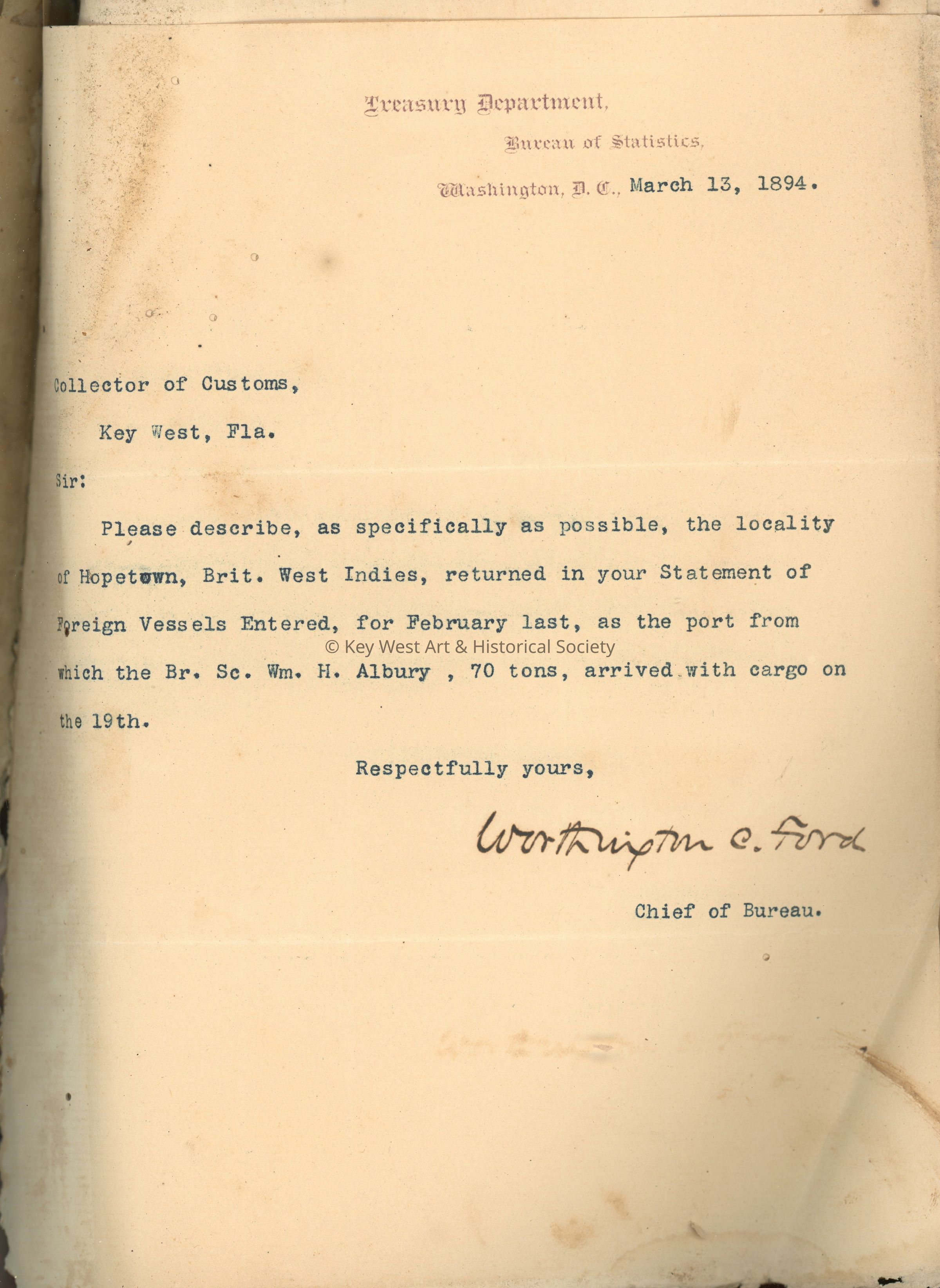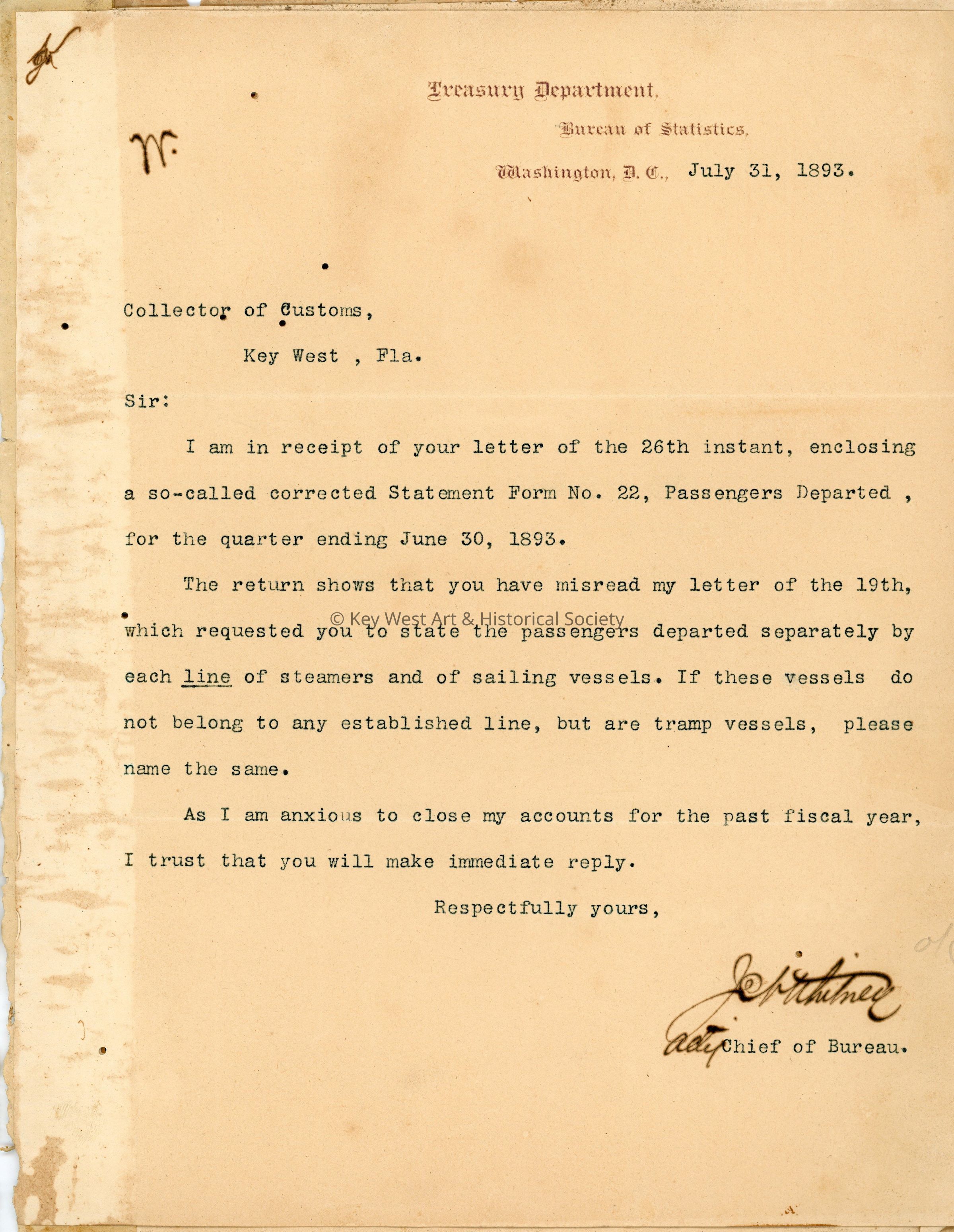 Letterbook from the Office of the Collector of Customs, Port of Key West, Florida. Mainly contains incoming correspondence from the Office of the Assistant Treasurer of the United States and the Bureau of Statistics. The letterbook has both hand written and typed correspondence, with the majority being form letters. Many of the letters were signed by S.G. Brock, Chief of the Bureau of Statistics.Collection