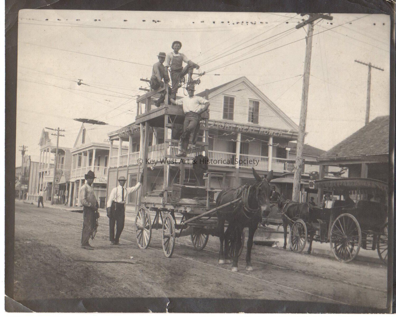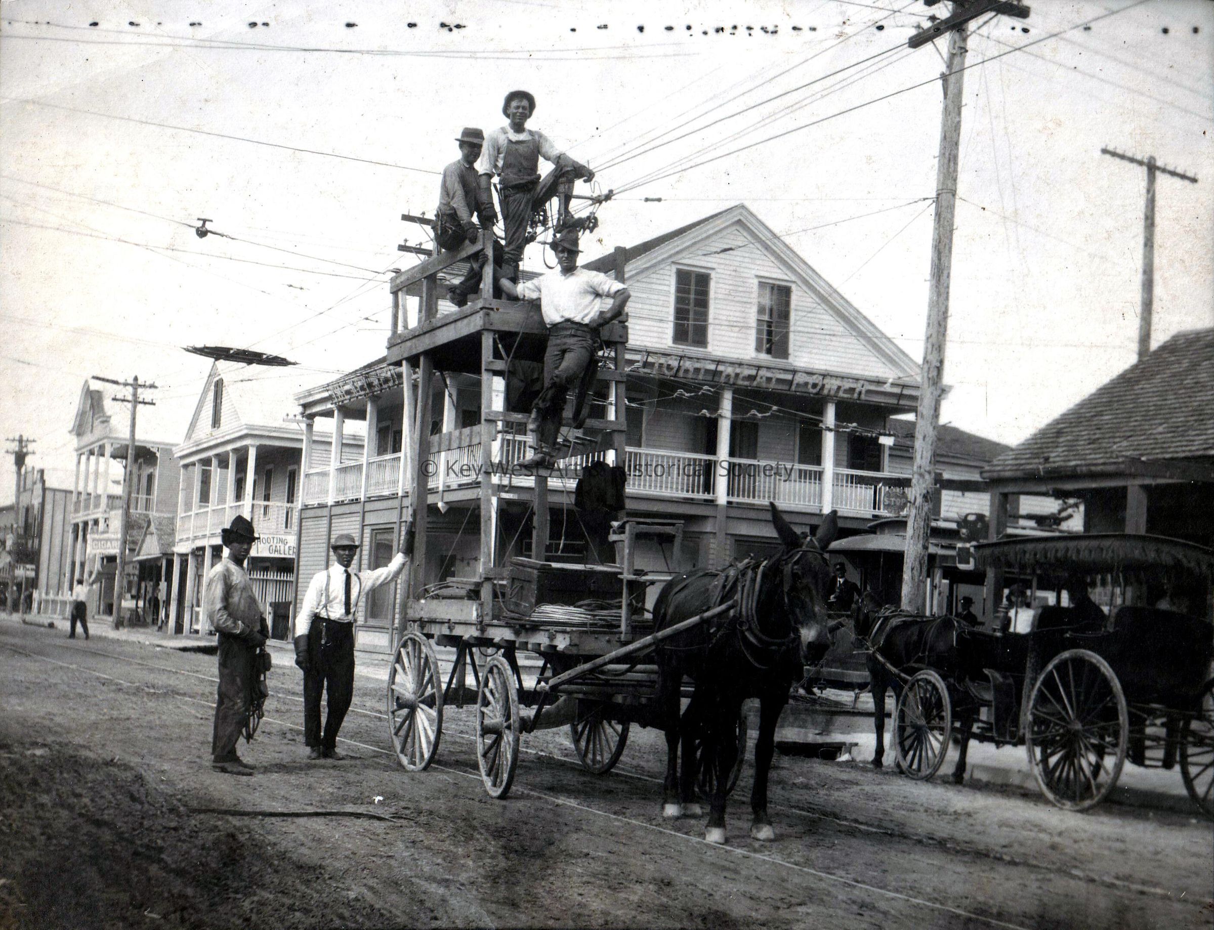 Black and white photograph of unknown men on a burro-drawn cart in front of the Key West Electric Company building at 141 Duval Street taken after the 1910 hurricane. The cart was operated by the electric company to fix power and telephone lines.