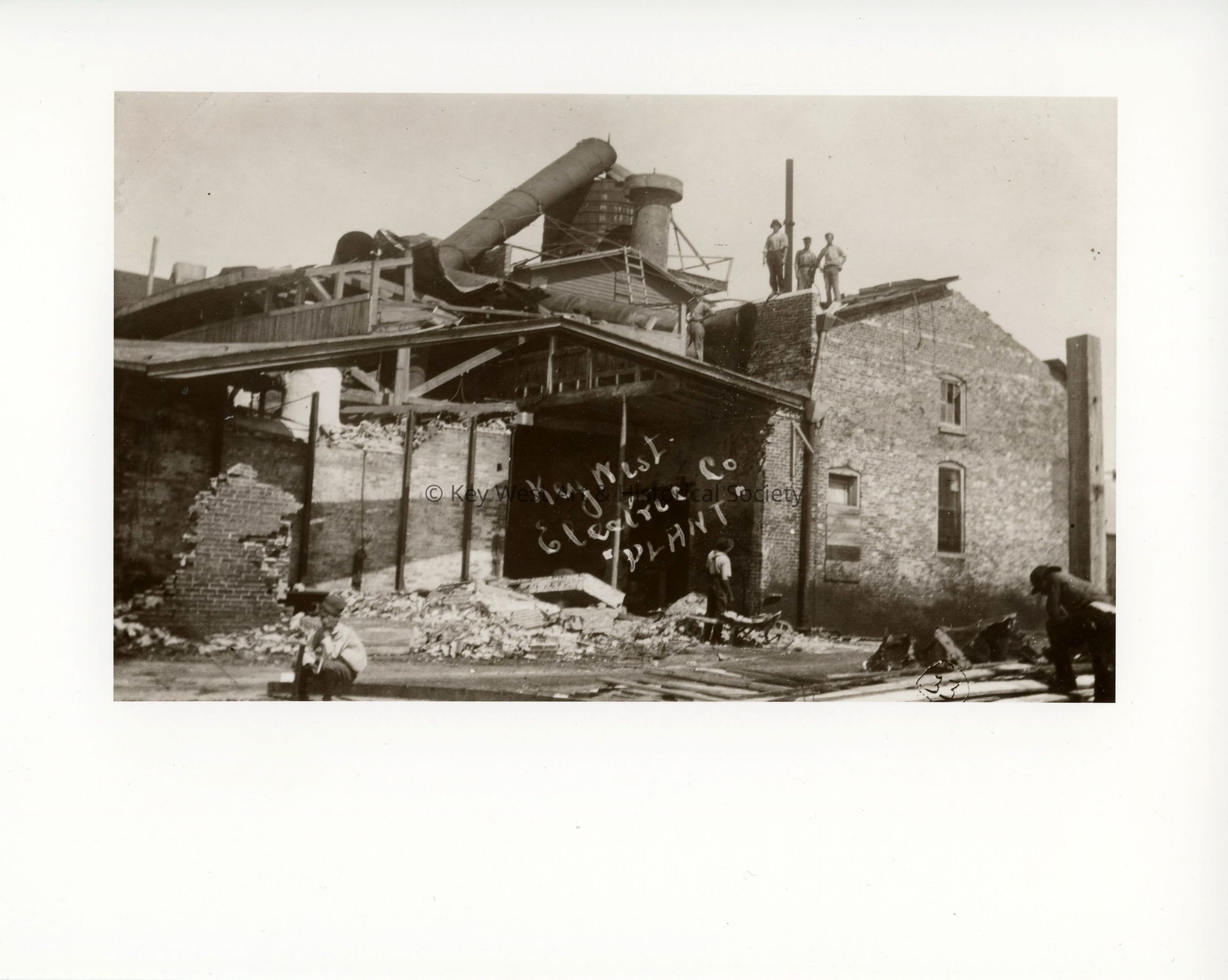 Black and white photograph of the Key West Electric Company Plant following the hurricane of 1910.