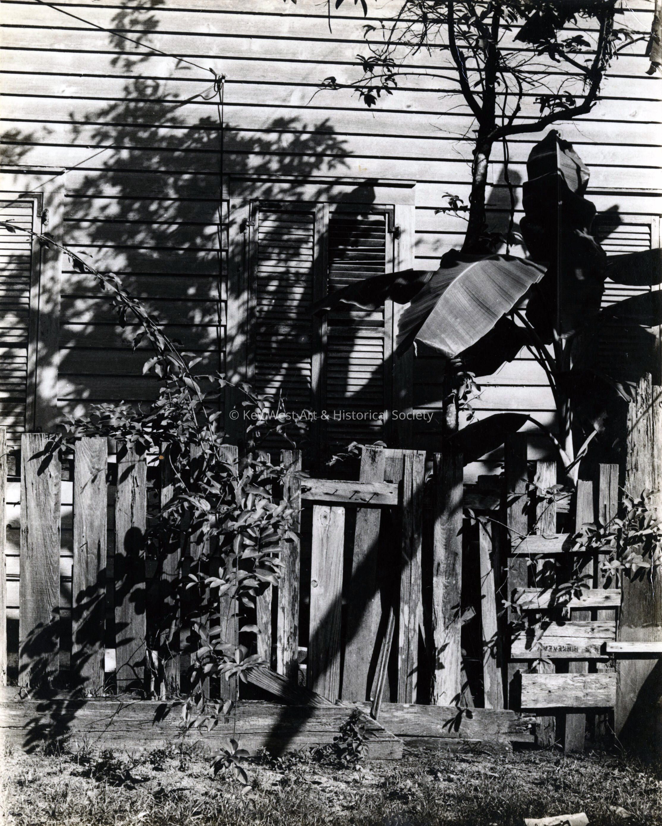 A black and white photograph of a fence alongside an unknown Key West house taken by Sheila Shaw.