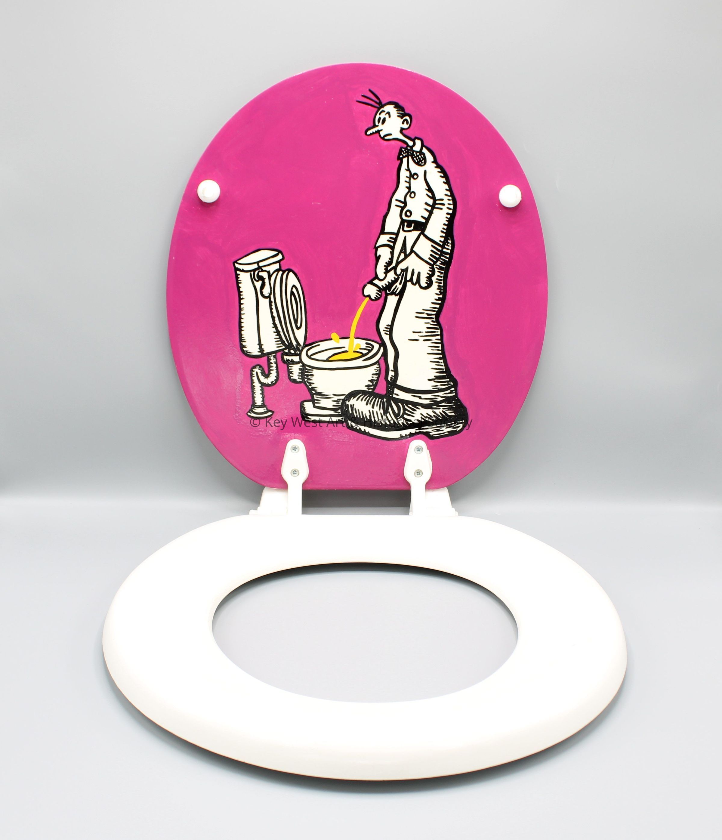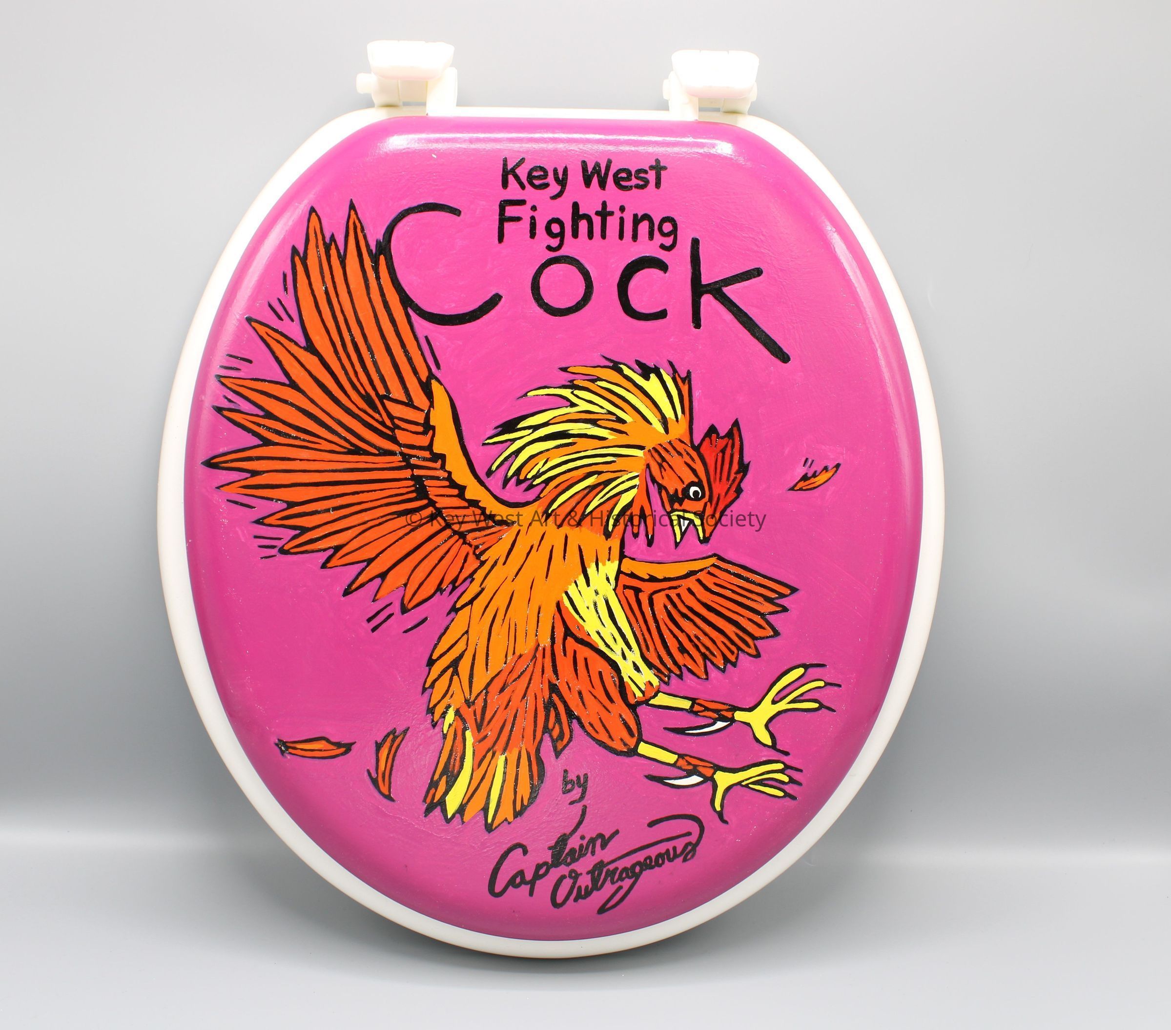 A toilet seat painted by artist Captain Outrageous. The top of the toilet lid depicts a rooster with the text 'Key West Fighting Cock' above. The underside of the toilet lid depicts a man urinating into a toilet bowl.Collection