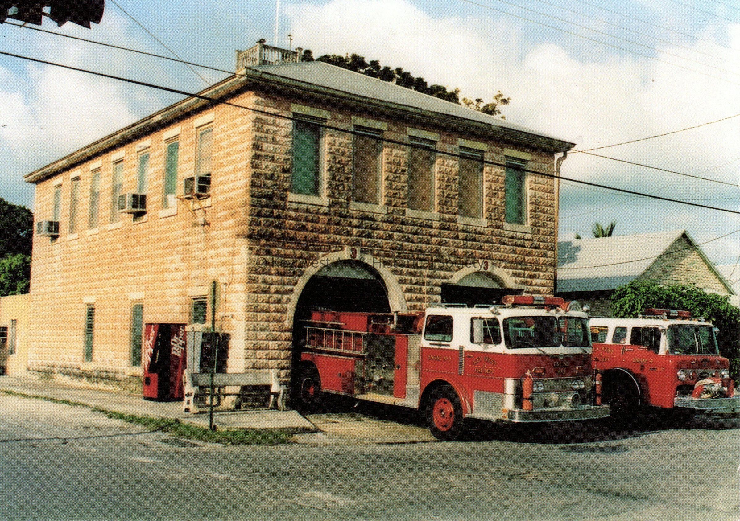 Postcard depicting fire trucks at fire station number 3 (Grinnell and Virginia Streets). The description on the verso reads, 'Key West, Florida. Number three fire station, corner of Grinnell and Virginia, is the oldest active fire station in the state of Florida. It was built in 1907.'Collection