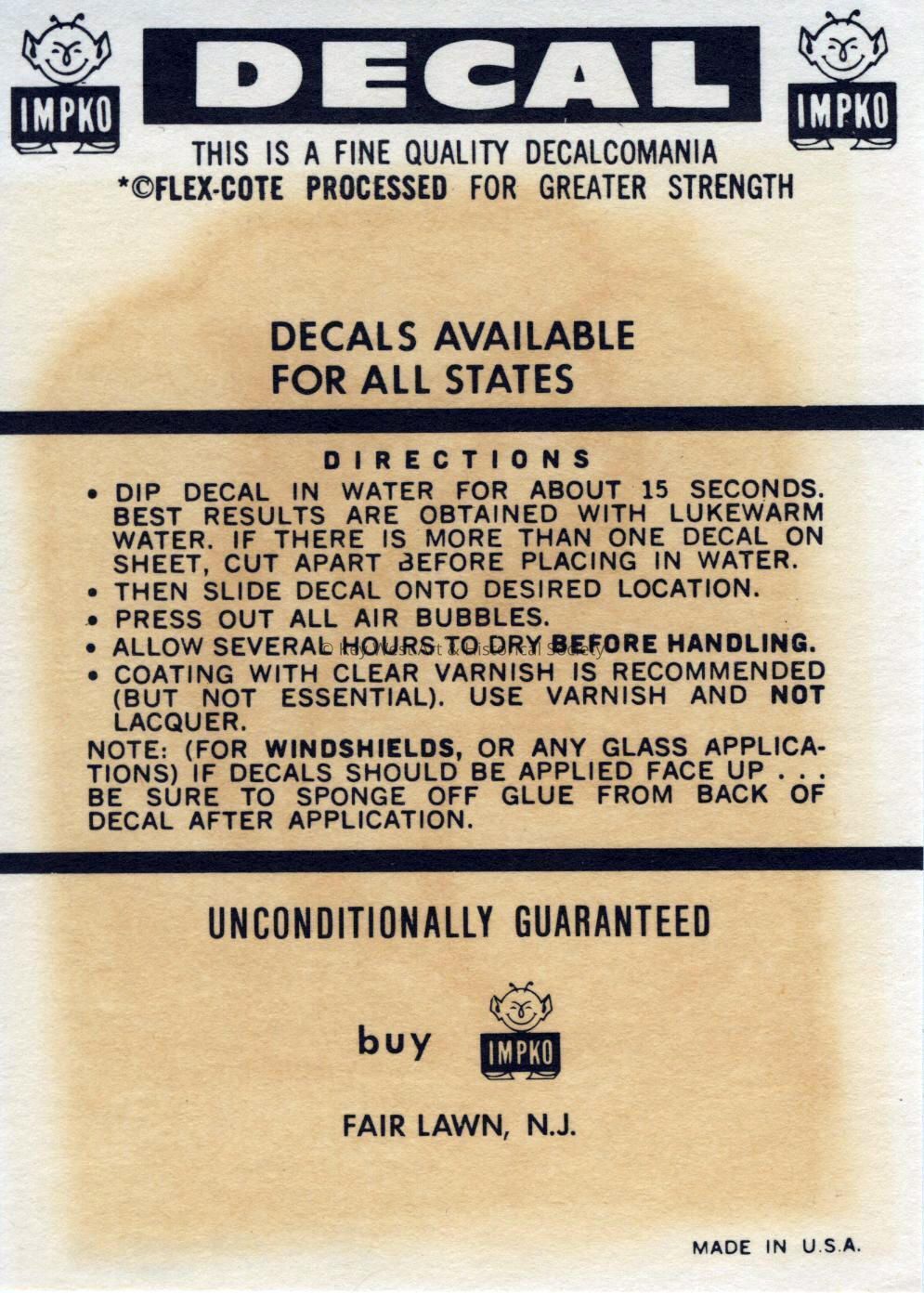 Instructions that accompanied the travel decal created by the Impko company depicting three fish, including a marlin.Collection