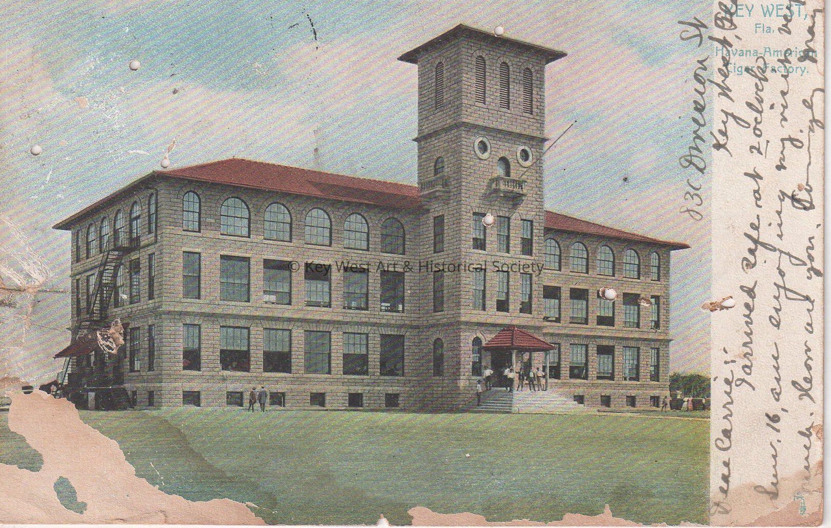 Postcard depicting the Havana American Cigar Factory that formerly stood on Flagler Avenue between Second and Third streets. The caption reads, ‘Key West, Florida, Havana – American Cigar Factory.’ The notation on verso reads, ‘The three story stone building of the Havana American Cigar Company is one of the most complete and conveniently arranged factories in the U.S. There are about 600 employees. The building, standing in the middle of artistically laid out grounds was begun in 1905, and with the site, cost over $100,000.’Subject Place