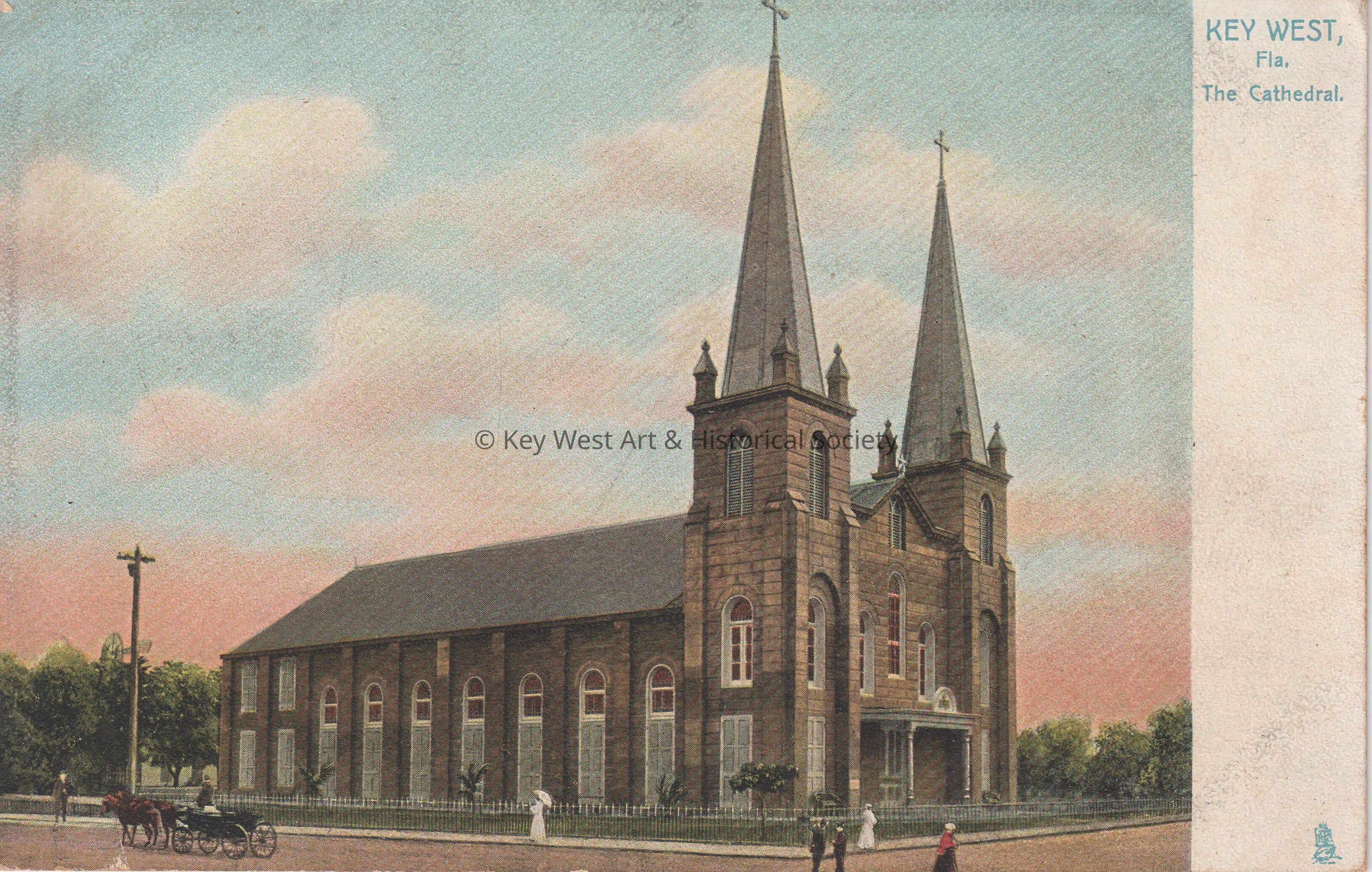 Postcard depicting people and a horse-drawn carriage near a late church. The caption reads, ‘Key West, Florida, The Cathedral.’ The description on the verso reads, ‘The Catholic Church situated at the corner of Division and Windsor Streets, was erected in 1904-5 at a cost of about $50,000. It is a very substantial, fire-proof building of concrete made with coral stones dug in the church grounds.’Subject Place