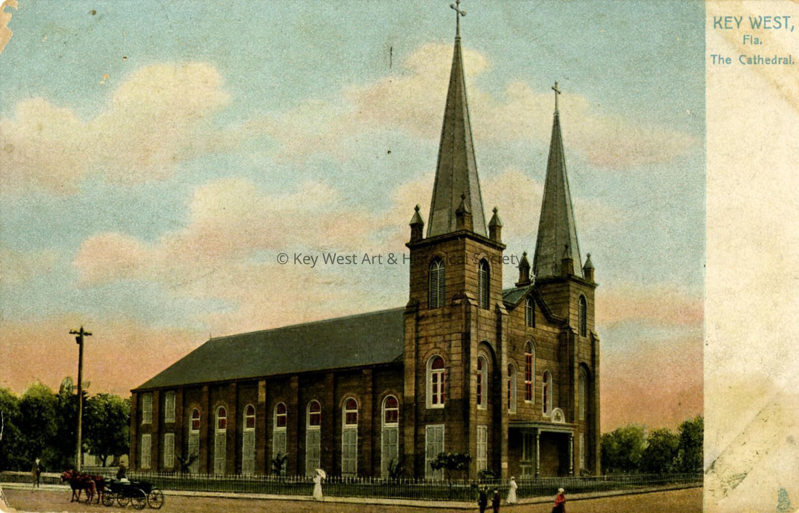 Postcard depicting Mary Immaculate Church on Truman Avenue. The caption reads, 'Key West Fla. The Cathedral.' Notation on verso, 'The Catholic Church, situated at the Corner of Division and Windsor Streets, was erected in 1904-5 at a cost of about $30,000. It is a very substantial, fire-proof building of concrete made with coral stones dug in the church grounds.'Subject Place