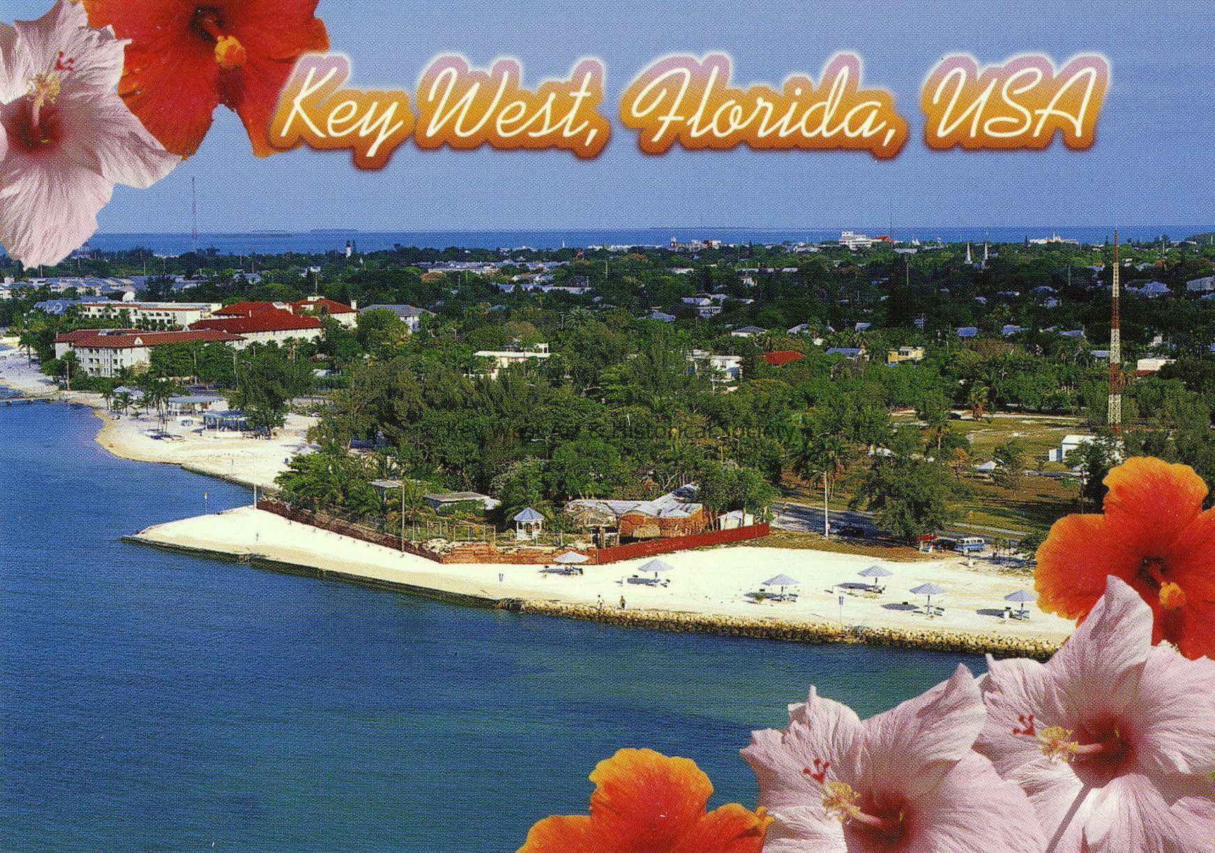 Postcard depicting Higgs Beach, Fort West Martello and the Casa Marina Hotel. The postcard is framed with pink and orange hibiscus flowers.Subject Place