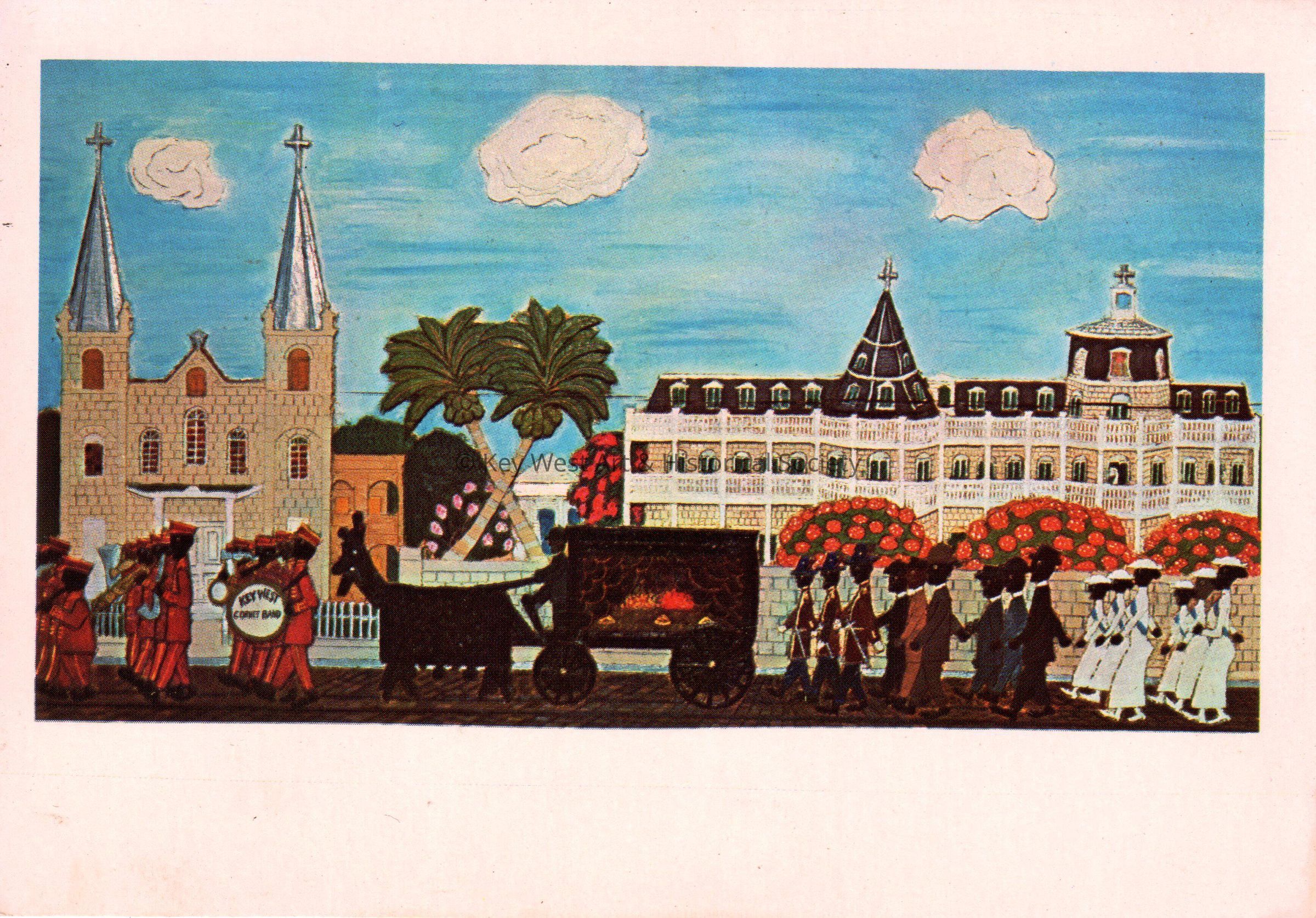 Postcard depicting a Mario Sanchez woodcarving of a band, horse-drawn hearse, and mourners walking in the street in front of a convent and church. The description on the verso reads, ‘Mario Sanchez “Key West Funeral” - 1963 - Painted Woodcarving. Catholic Church and Convent, Key West, Florida (Truman Avenue at Windsor Lane). Collection “El Kiosko”, Key West, Florida.’Collection