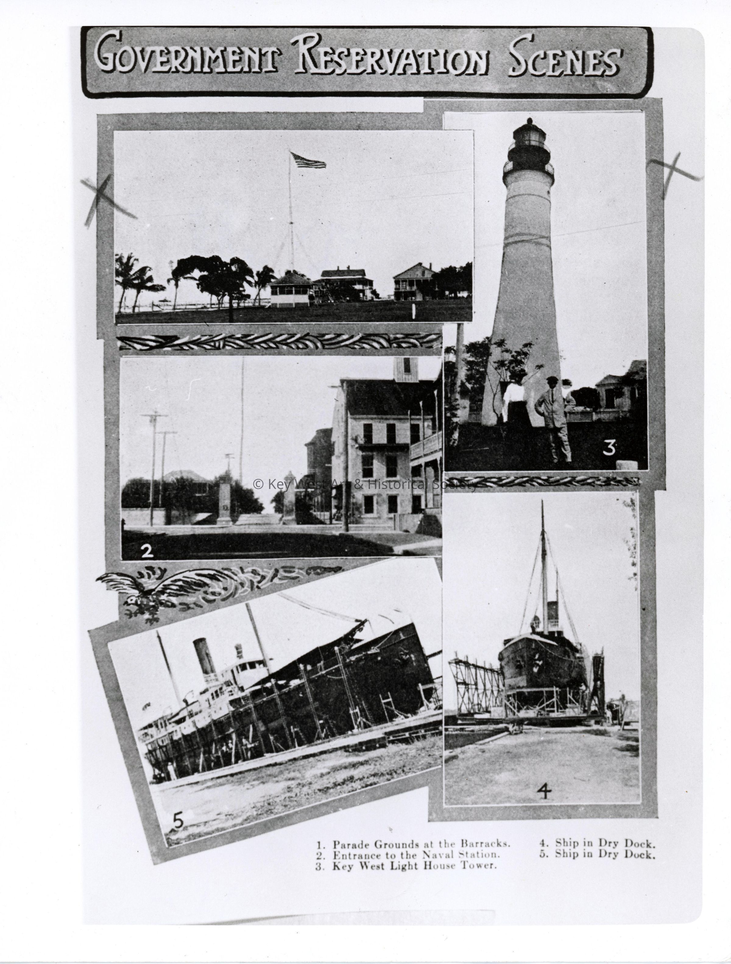 Black and white photograph of a grouping of Government Reservation Scenes in Key West including the Parade Grounds at the Barracks, the Entrance to the Naval Station, Key West Lighthouse and two ships in dry dock.