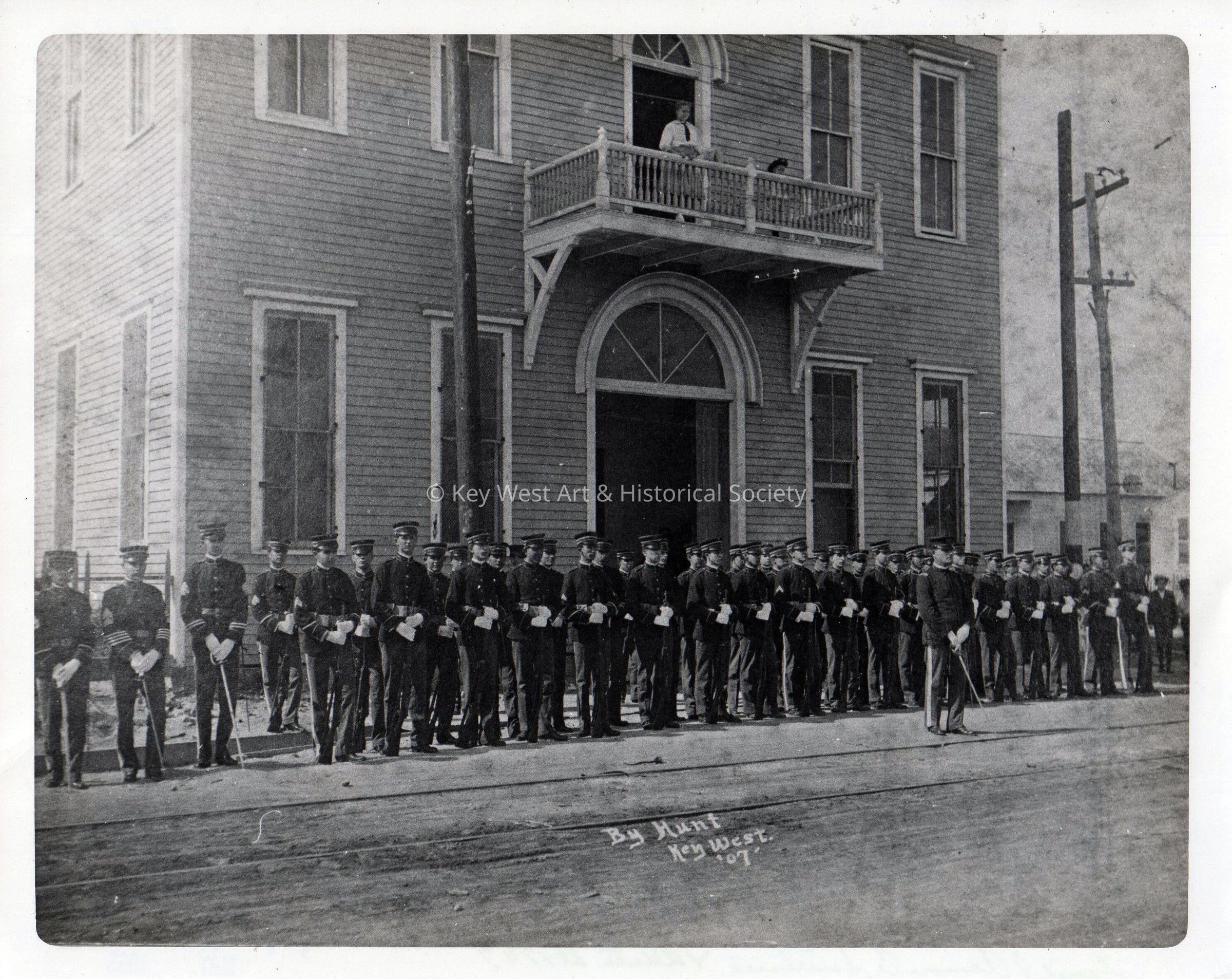 Black and white photograph of the Key West Guard in front of the Armory Building at the corner of Southard and White streets in Key West.