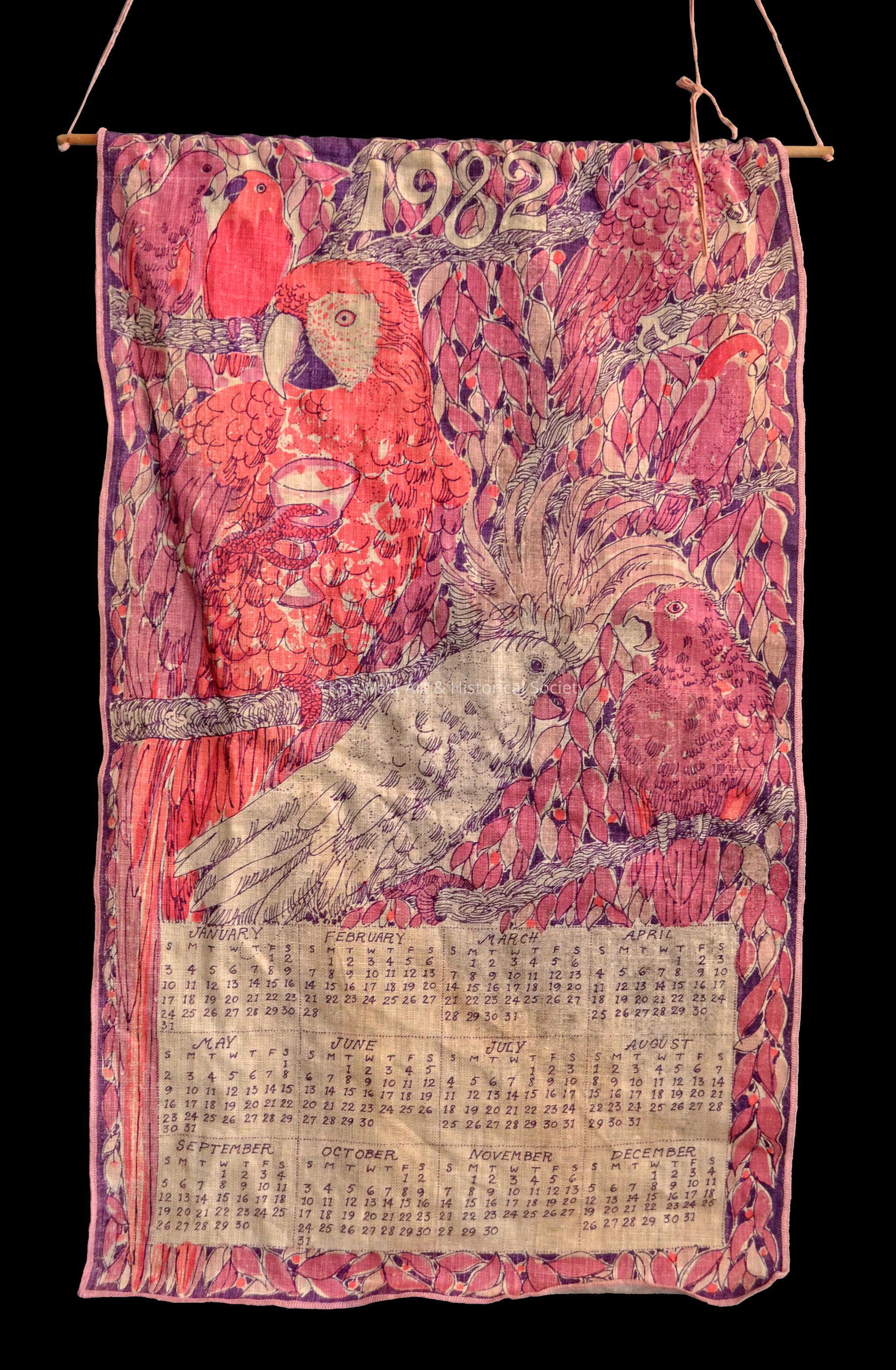 Key West Hand Print Fabrics Calendar designed by Suzie 'Zuzek' dePoo depicting several birds including parrots and a cockatoo.Collection