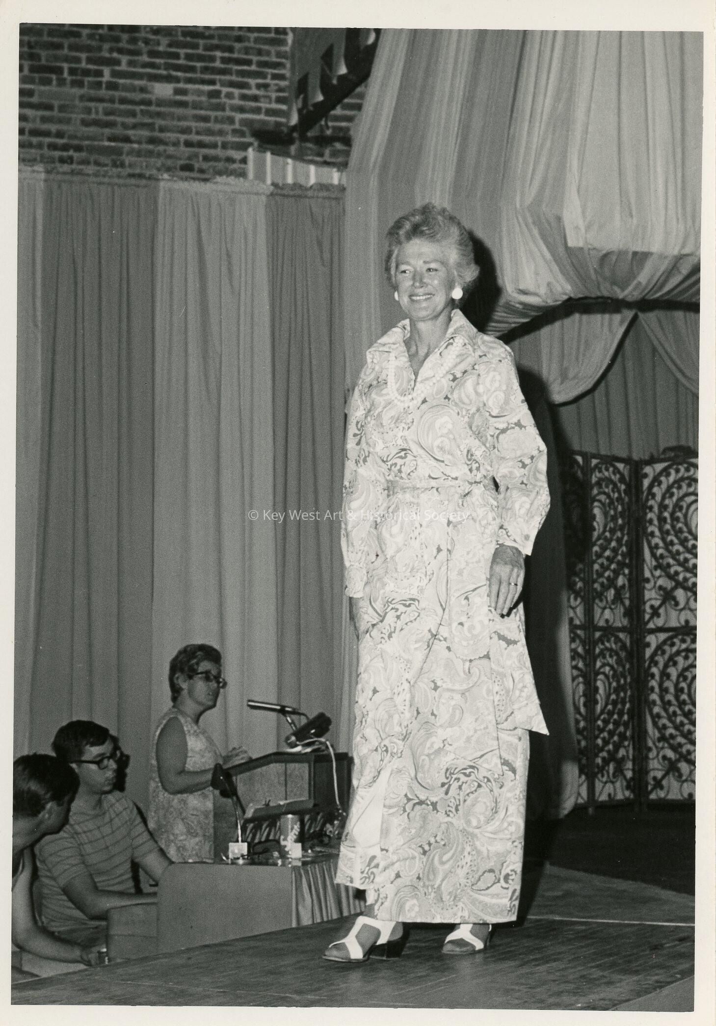 Frances Henderson Leach walking the runway during a Key West Hand Print Fabrics fashion show at US Navy Building 1 at 291 Front Street.