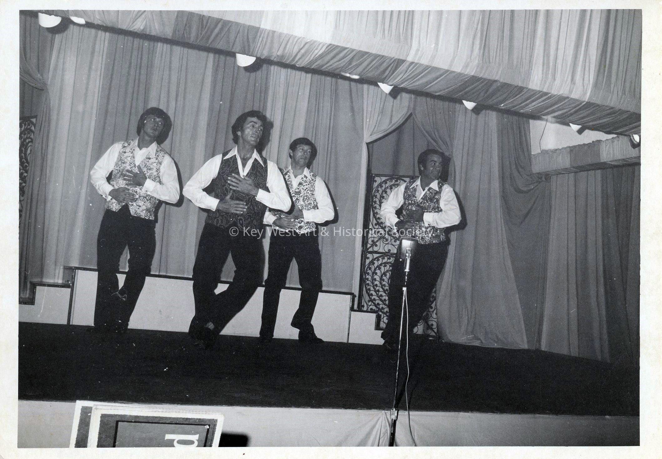 Jim Russell and three unknown people dancing on stage during a Key West Hand Print Fabrics fashion show at US Navy Building 1 at 291 Front Street.