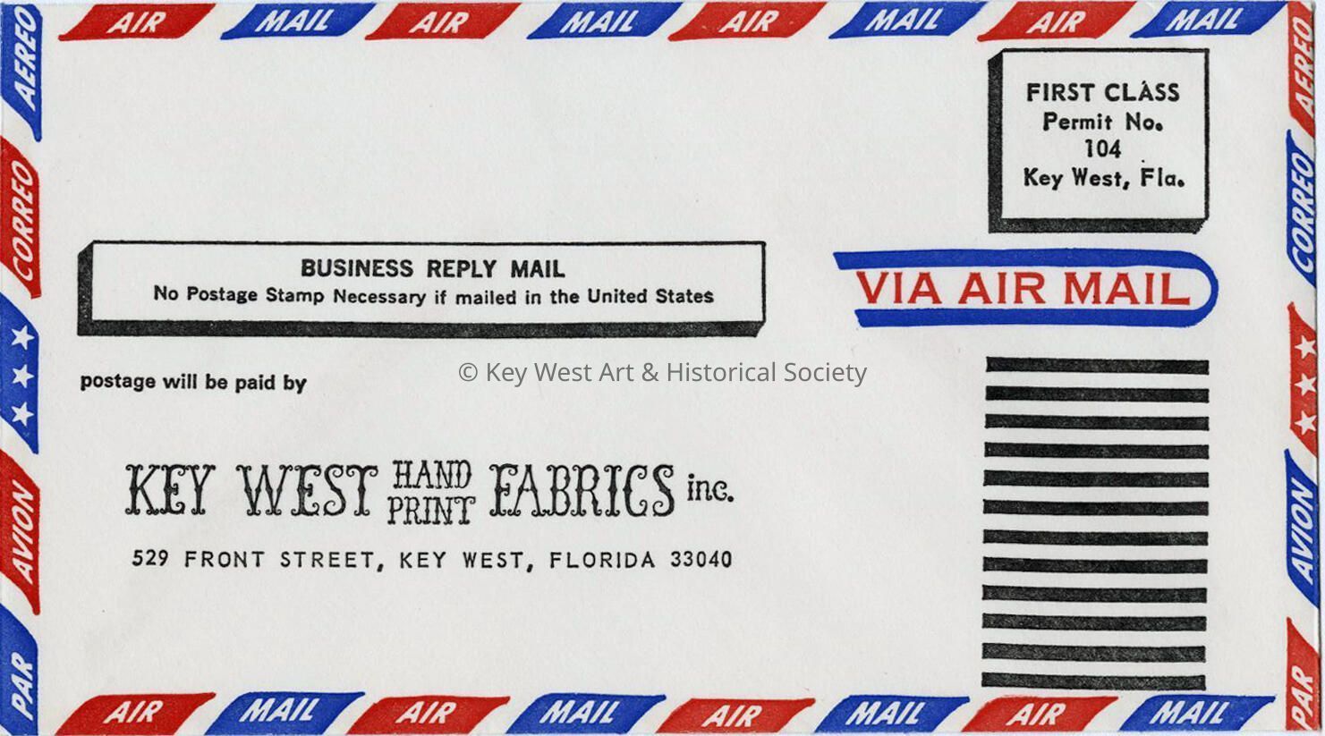An empty air mail envelope produced by the Key West Hand Print Fabrics factory for the 1972 season. Samples in various colors and patterns were sent via mail to potential customers along with an order form and an envelope.
