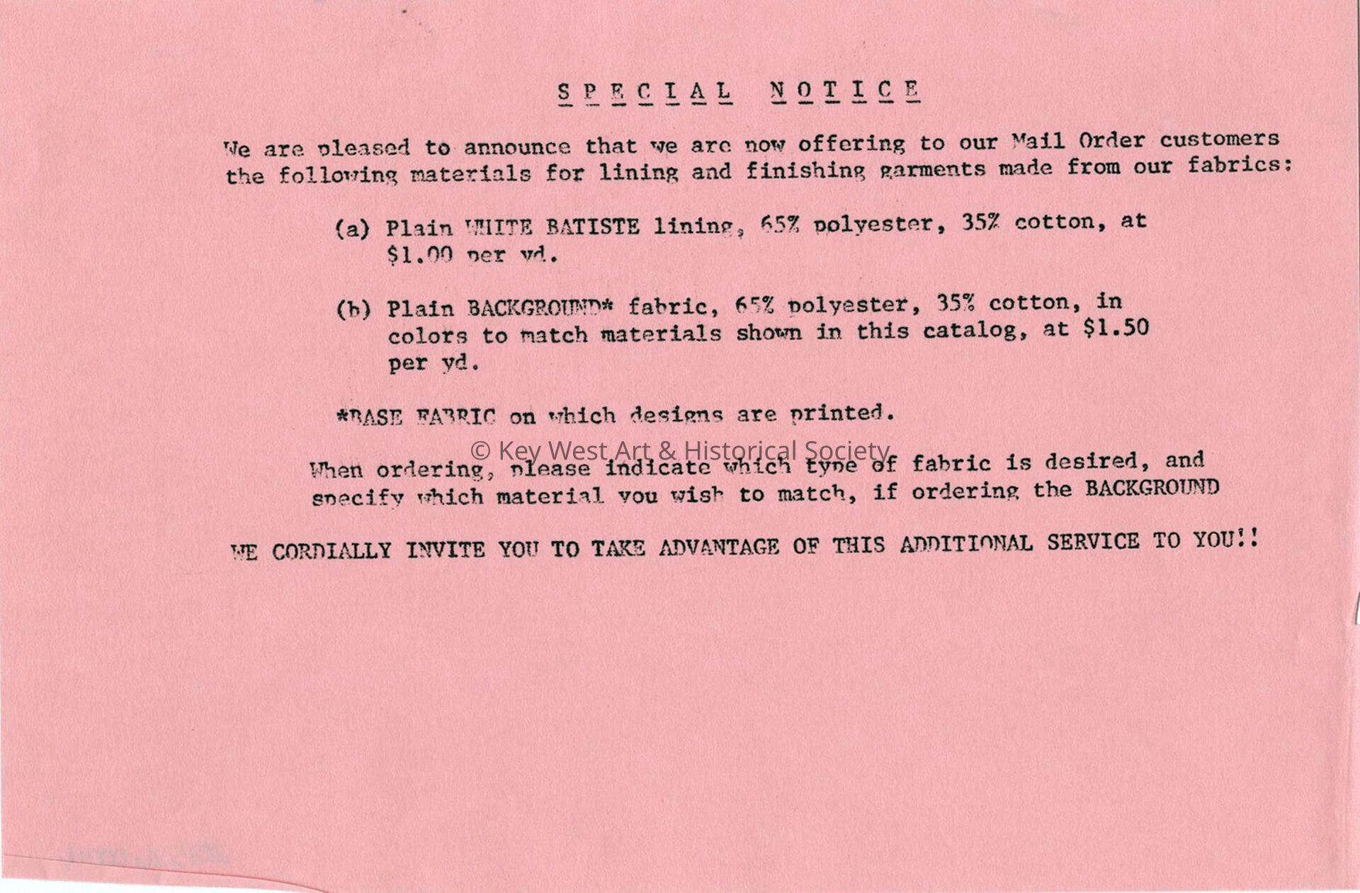 A special notice produced by the Key West Hand Print Fabrics factory for the 1972 season. Samples in various colors and patterns were sent via mail to potential customers along with a special notice about adding lining to finished garments.Collection
