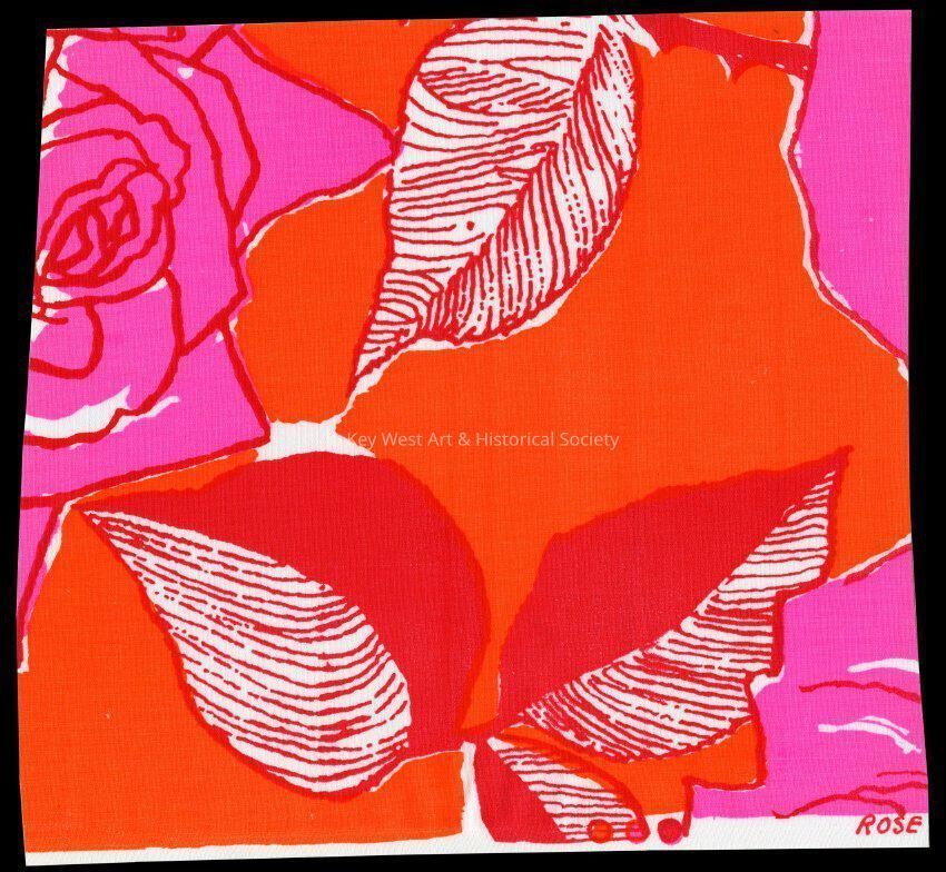 Swatch of fabric designed and printed by Key West Hand Print Fabrics entitled 'Rose Bud'. This pattern was used by Lilly Pulitzer.