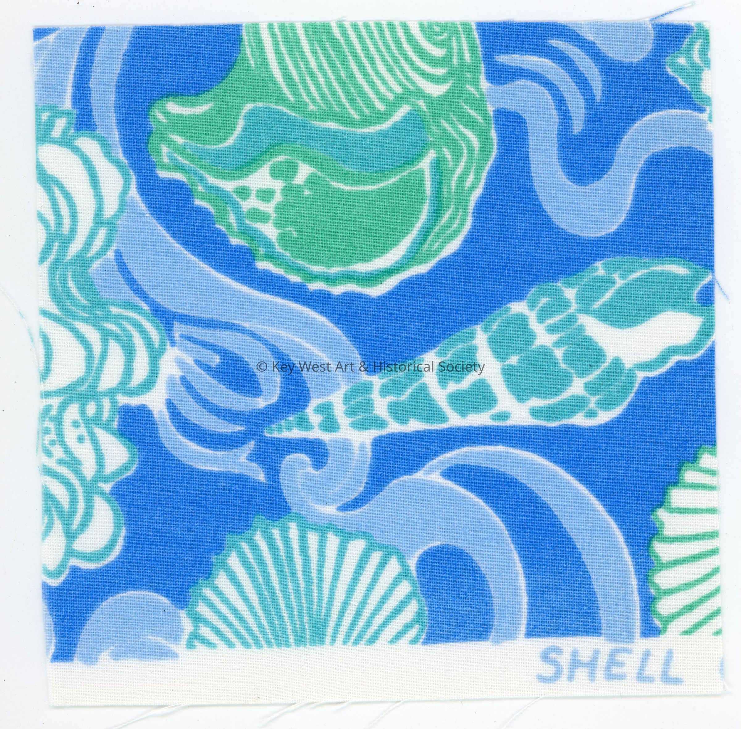 Swatch of fabric designed and printed by Key West Hand Print Fabrics. The bottom right has text that reads 'SHELL.'