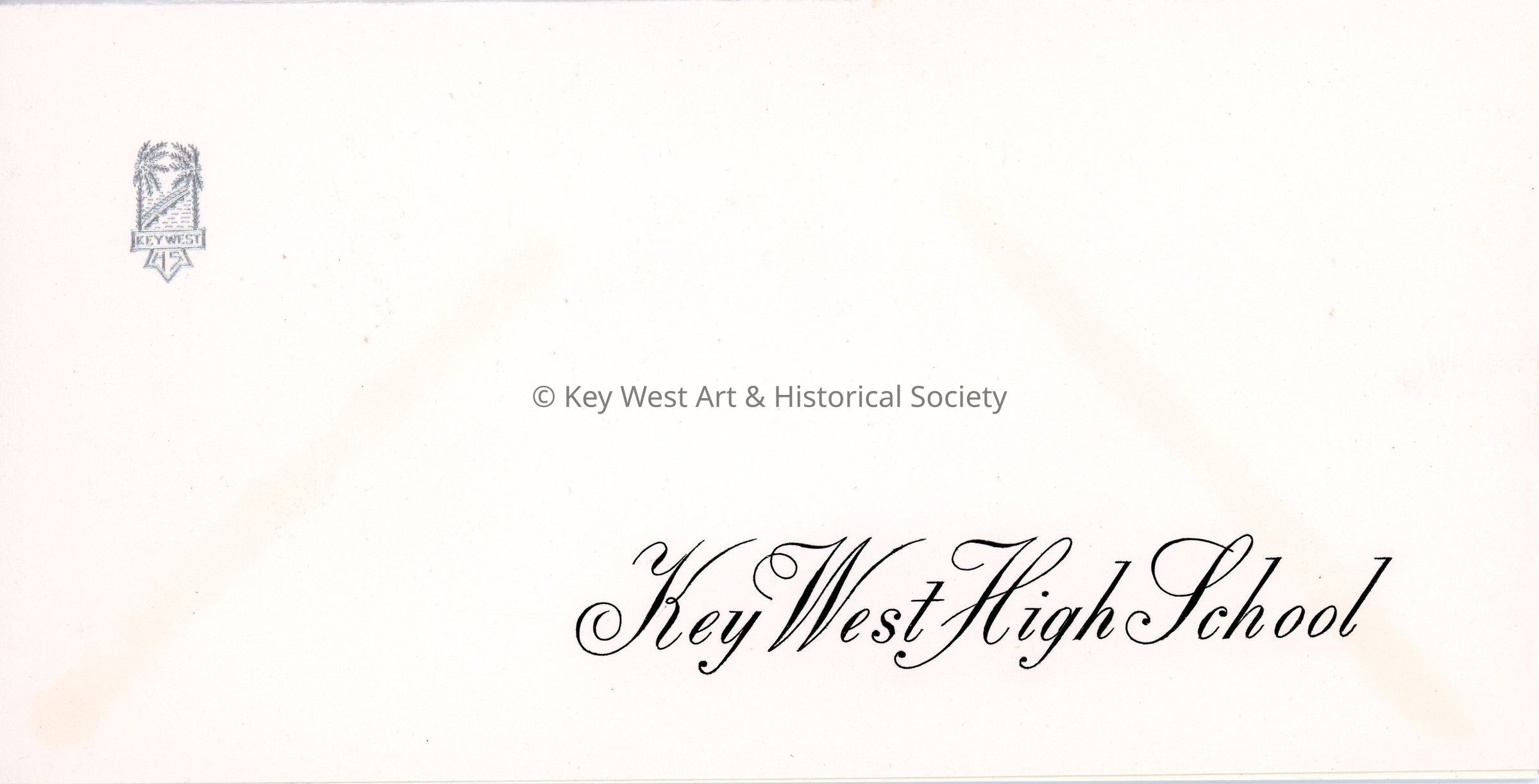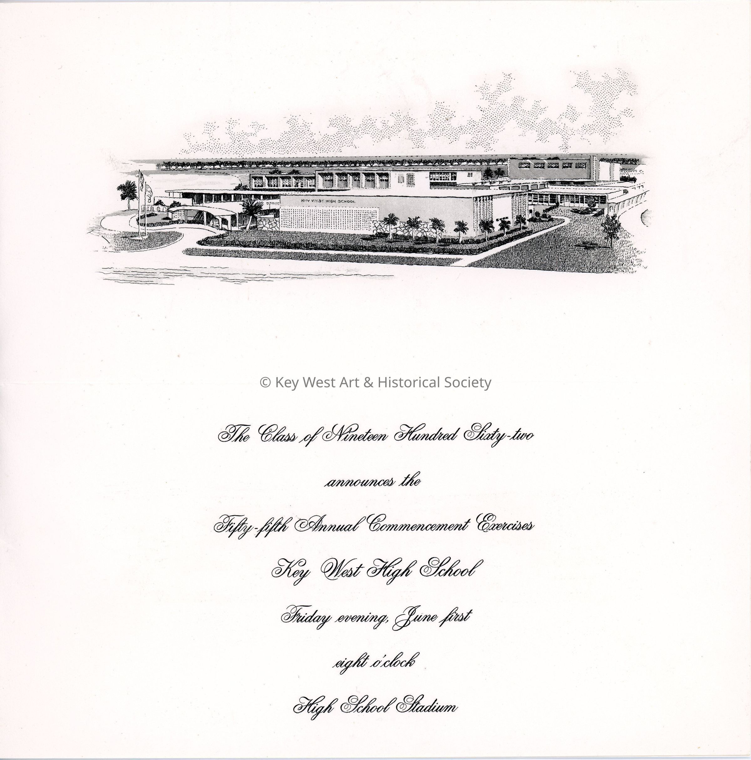An invitation to the Key West High School 55th Annual Commencement Exercises for the Class of 1962. The recto has a small silver crest in the upper left corner and 'Key West High School' to the lower right. The interior of the card has a black and white depiction of the school. The ceremony was held on June 1st, 1962.