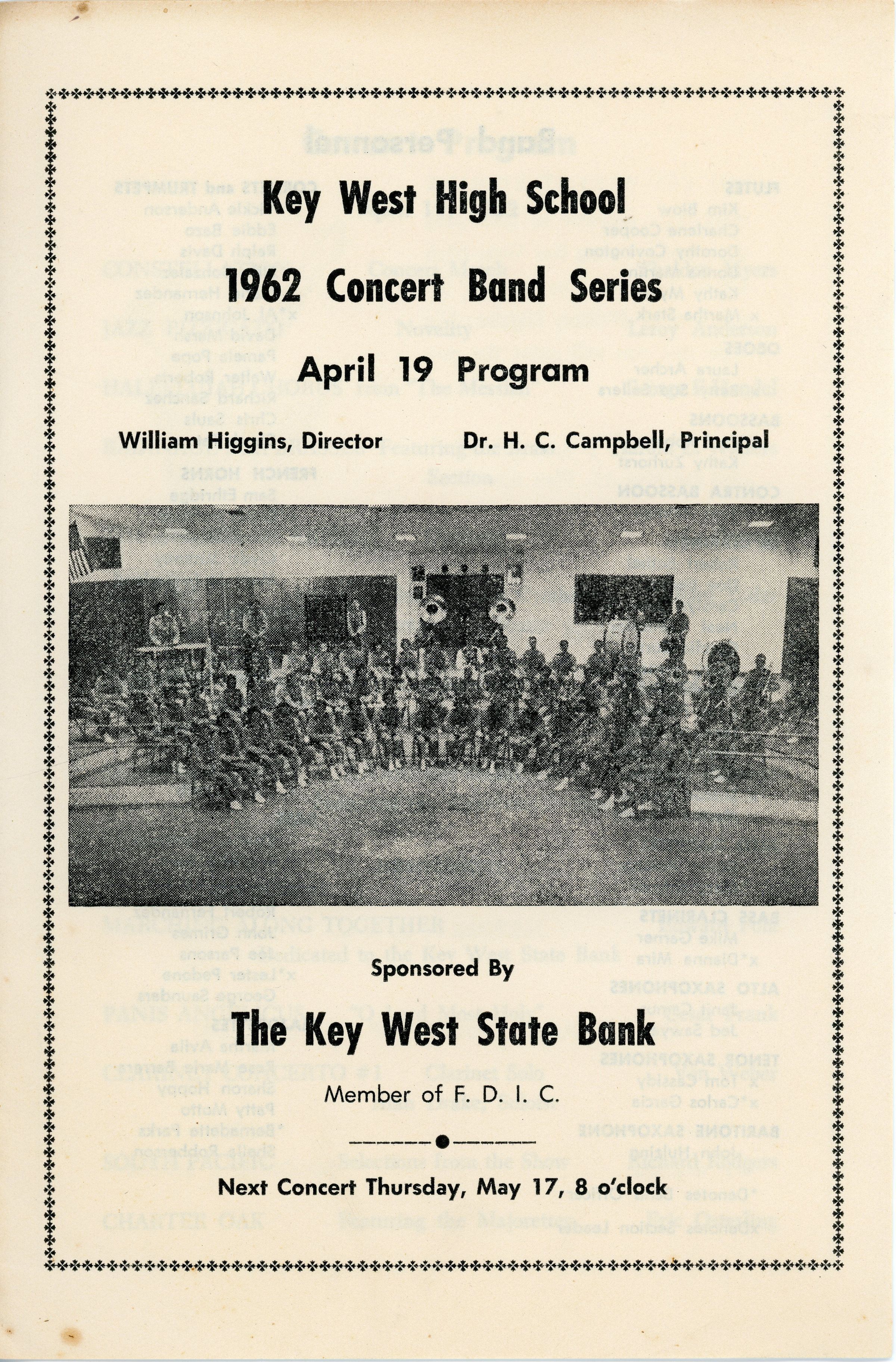A program for the April 19, 1960 concert by the Key West High School Concert Band directed by William Higgins. The concert series was sponsored by Key West State Bank.