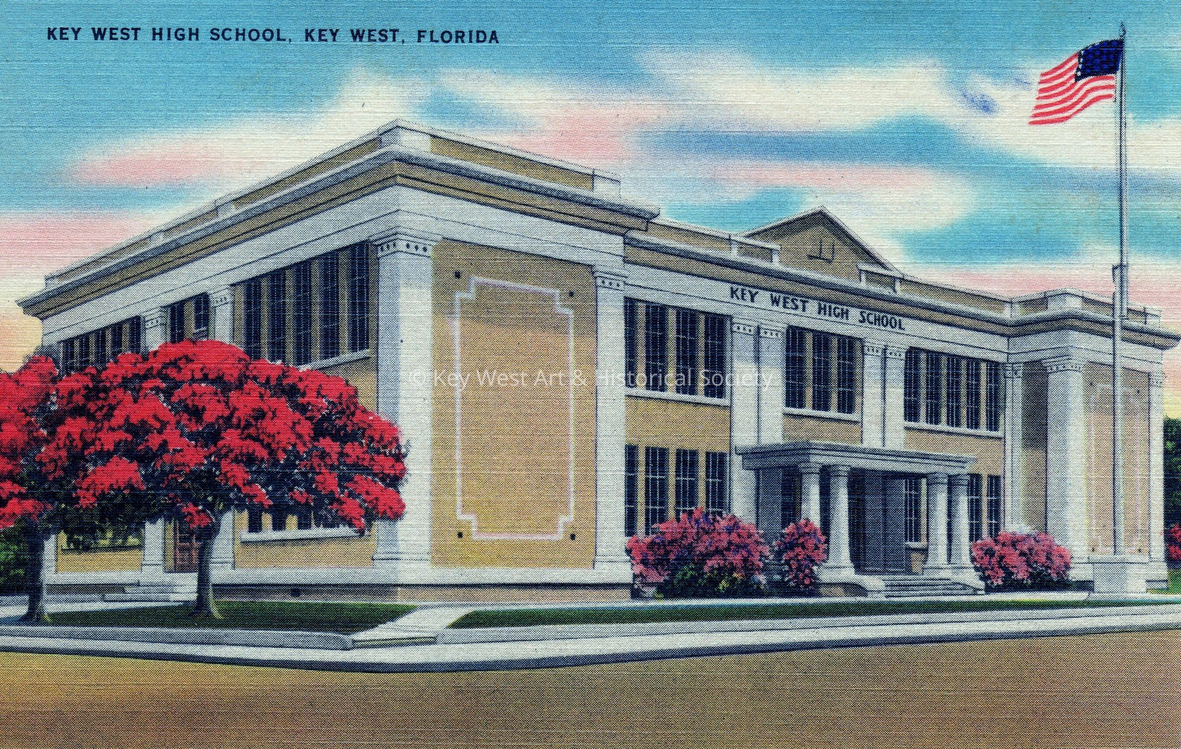 Postcard of Key West High School when it was located at 1300 White Street. Caption reads, ‘Key West High School, Key West, Florida’.Subject Place